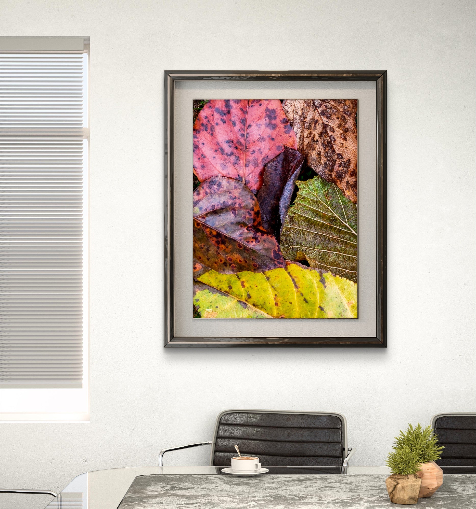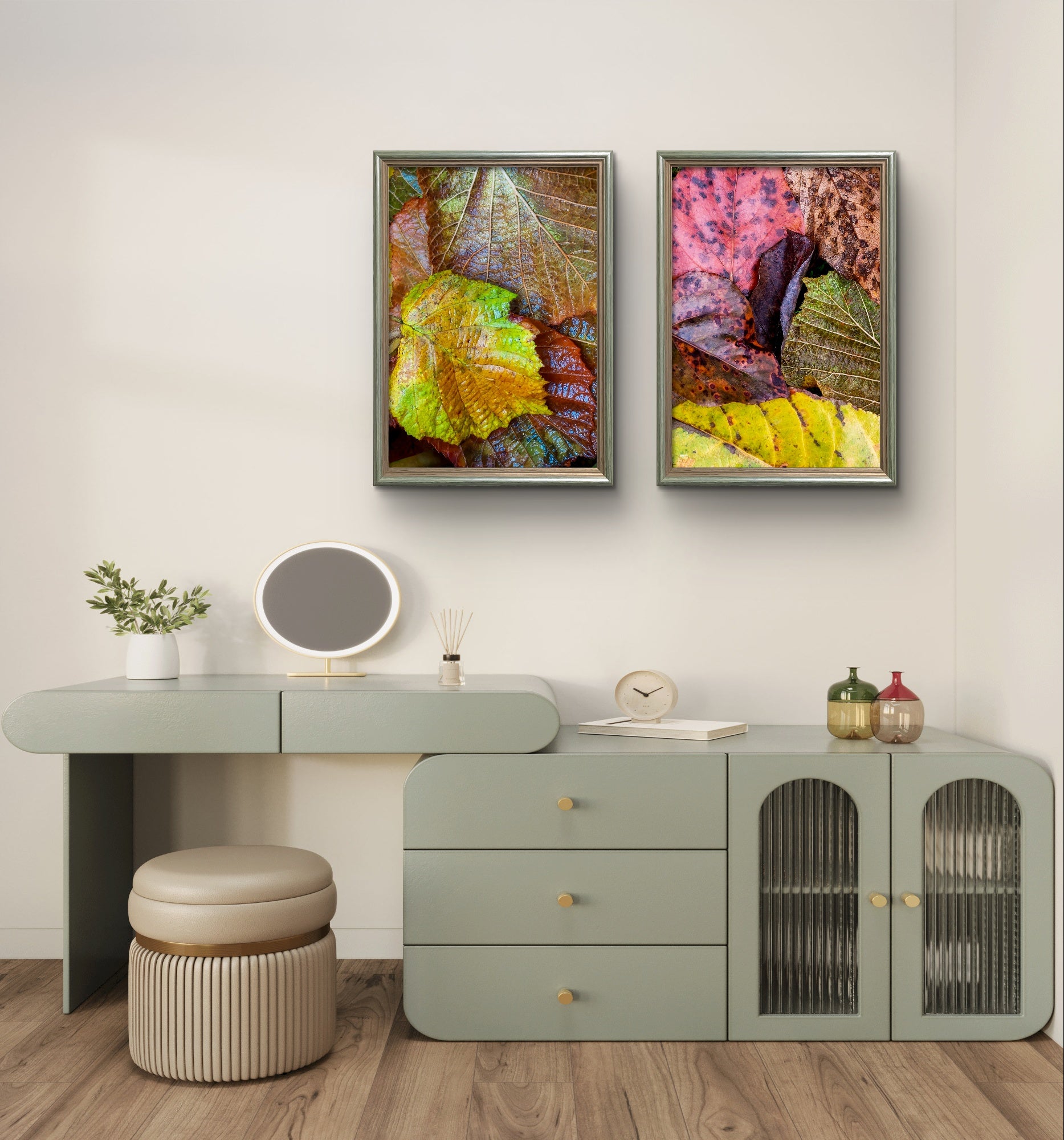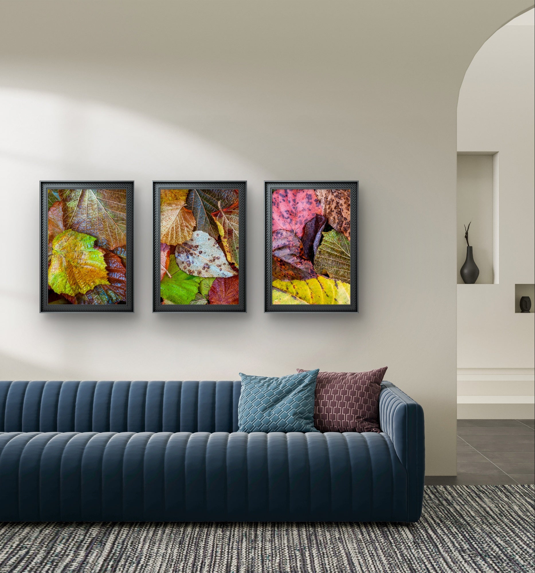 A: This collection captures nature's complete autumn spectrum including warm yellows, bright oranges, rich reds, deep burgundies, golden browns, and subtle greens. The macro photography reveals secondary colors often missed in casual viewing - pink undertones, purple shadows, amber highlights, and copper accents. Each print contains multiple color variations within individual leaves, providing the visual complexity necessary for stress reduction benefits while ensuring coordination with diverse interior palettes from neutral to bold color schemes.