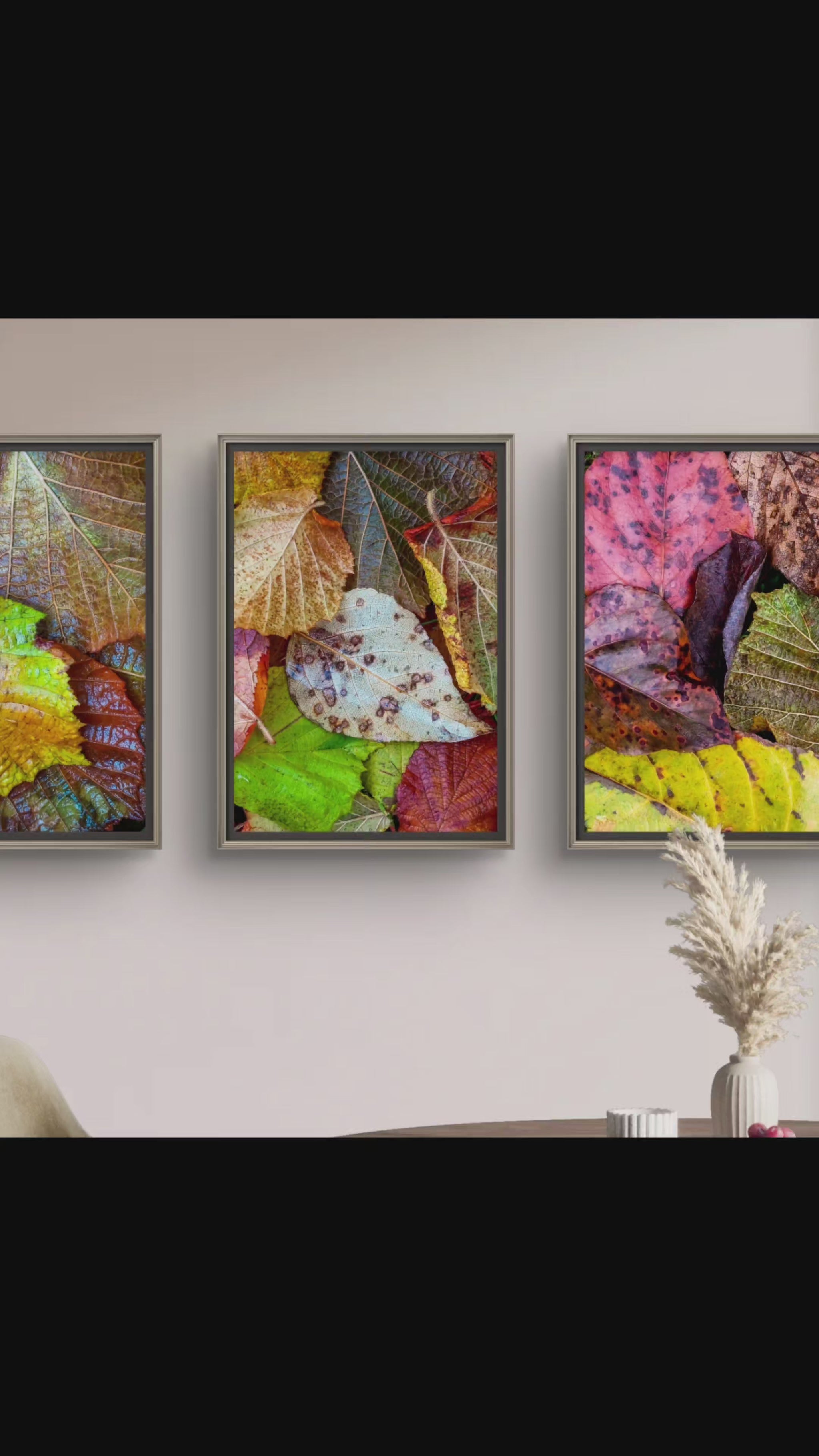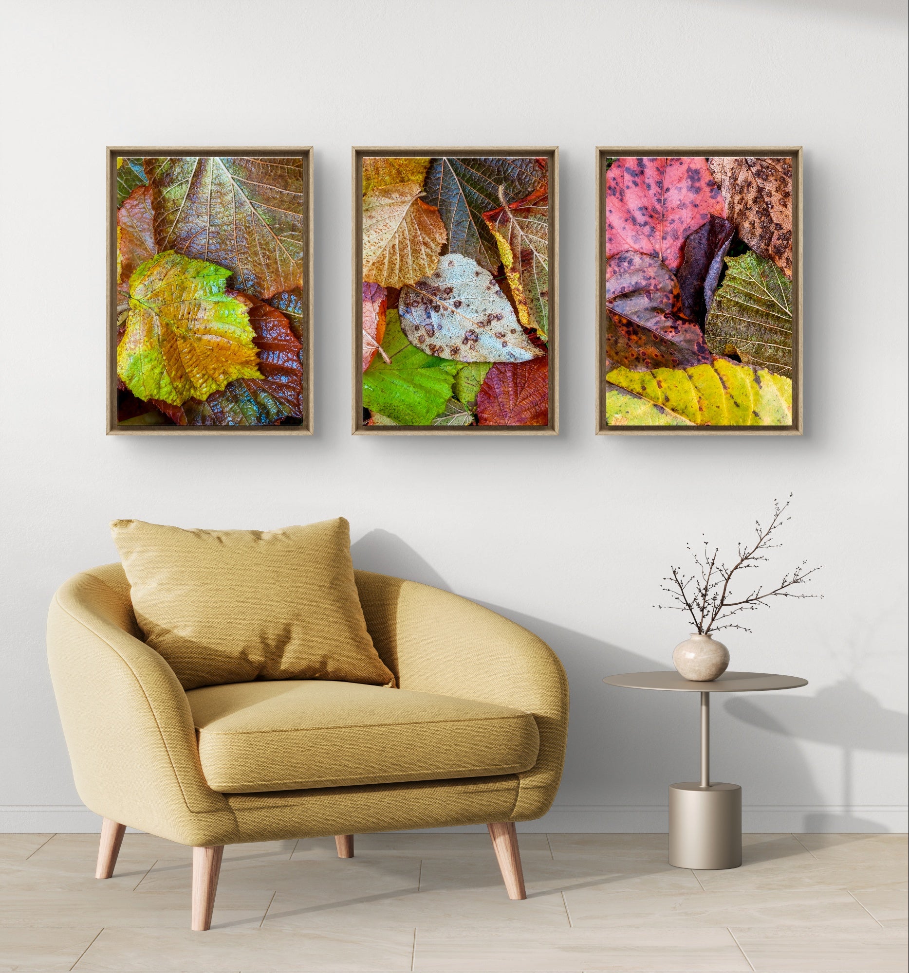 Transform narrow spaces with this stunning trio of vertical autumn leaf prints featuring authentic macro photography. Each canvas captures nature's vibrant color spectrum through professional closeup techniques, revealing intricate textures and brilliant hues invisible to casual viewing.