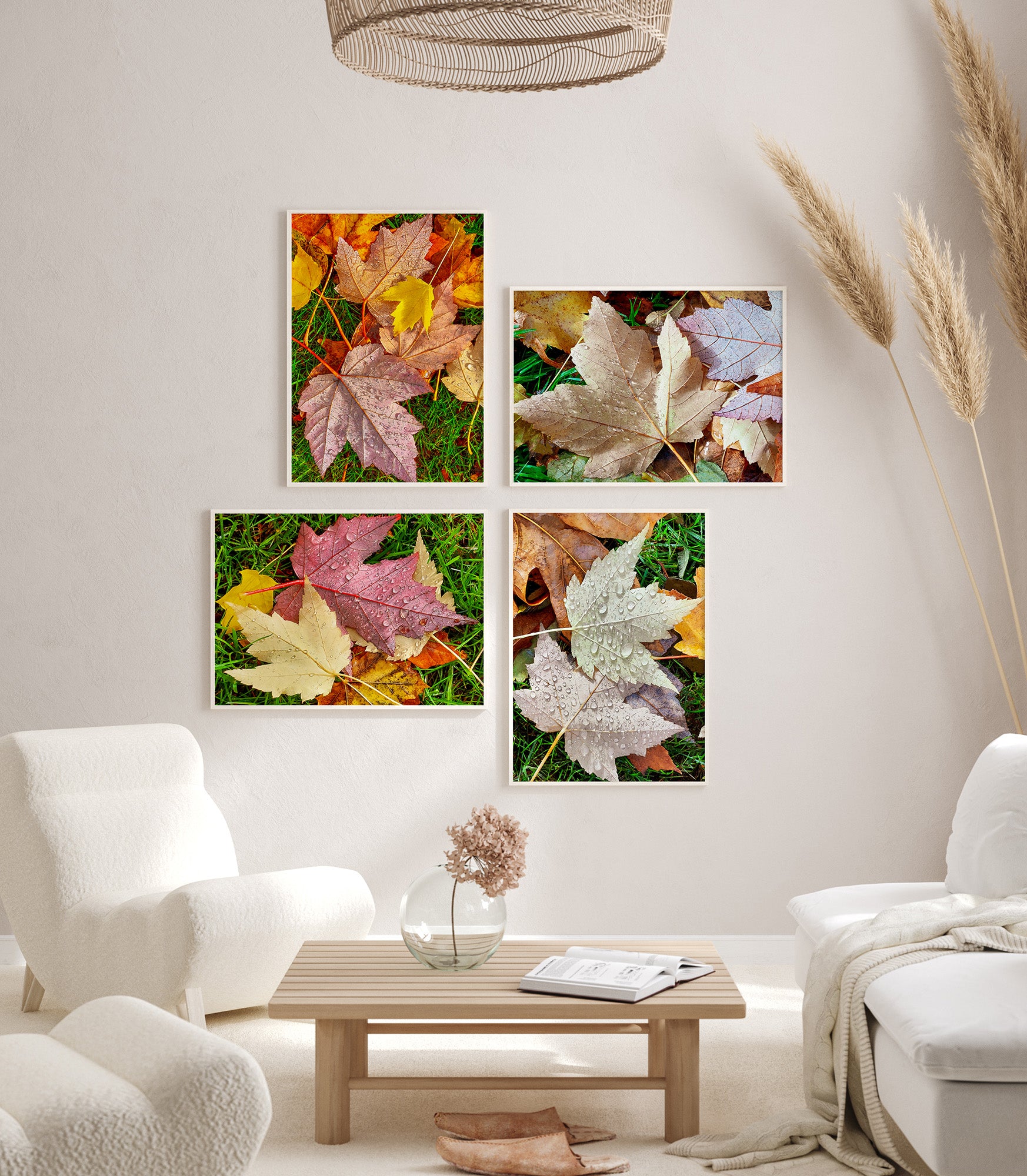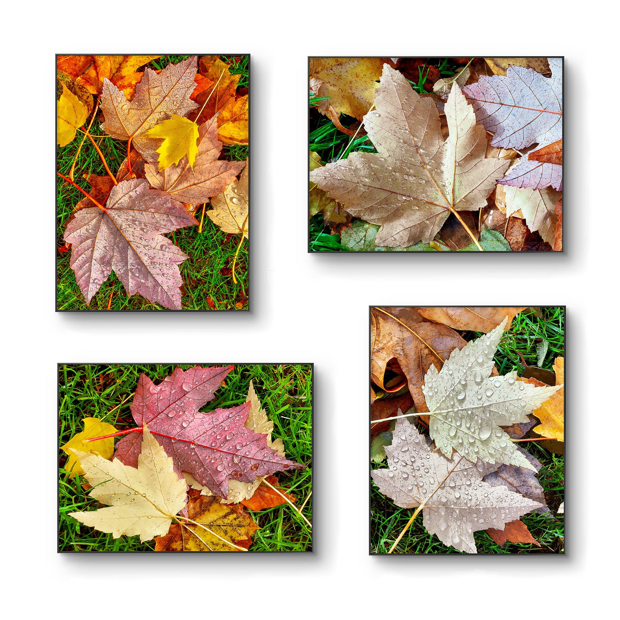 Autumn Rain Vibrant Leaves Authentic Macro Photography | Unstretched Canvas Print Set of 4 | Mixed Orientation Wall Art