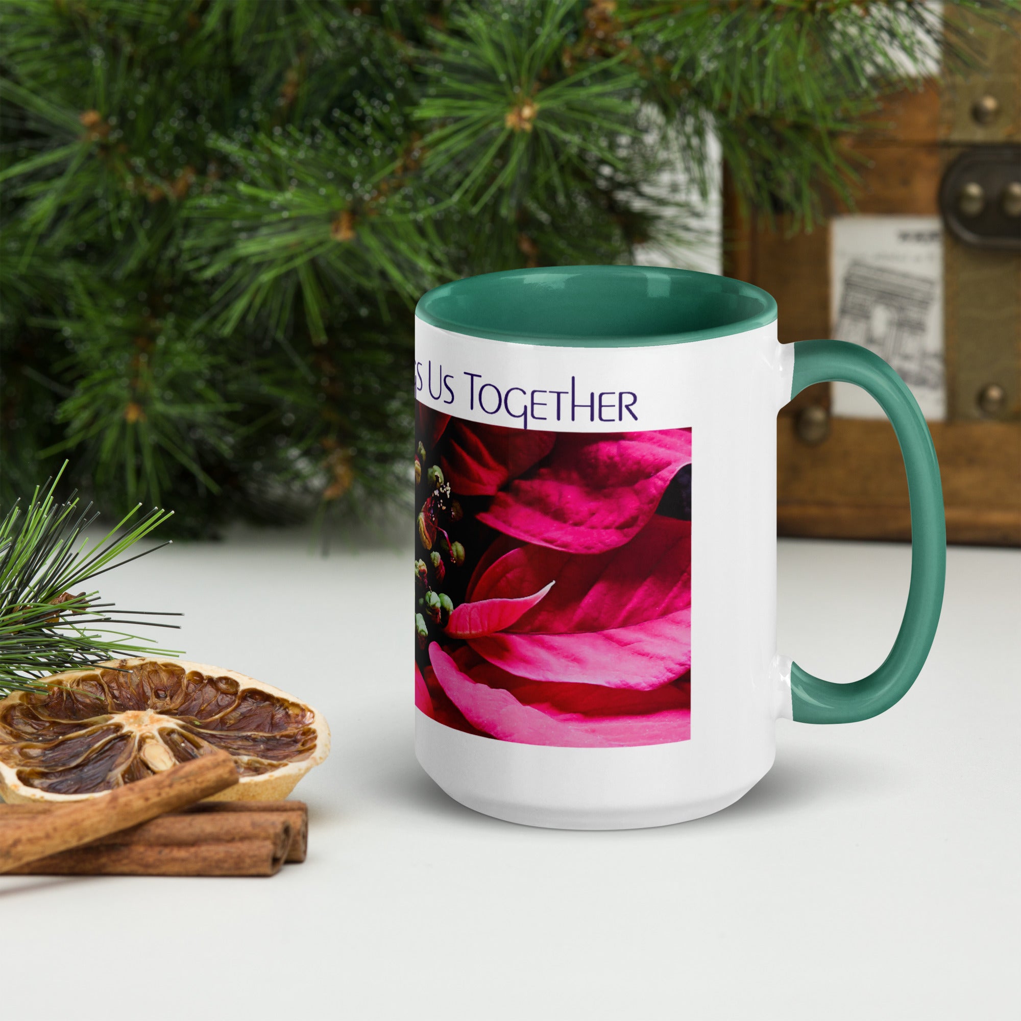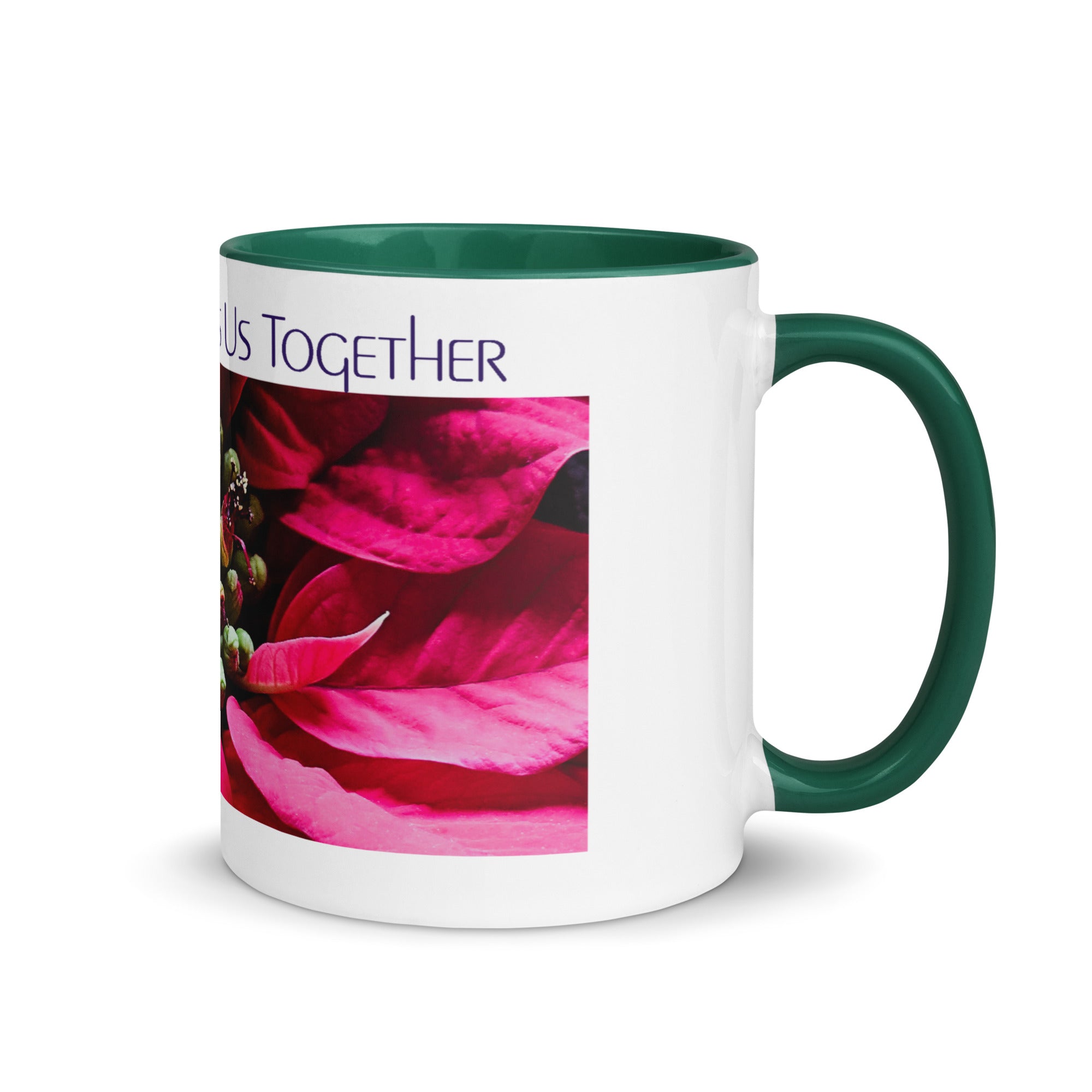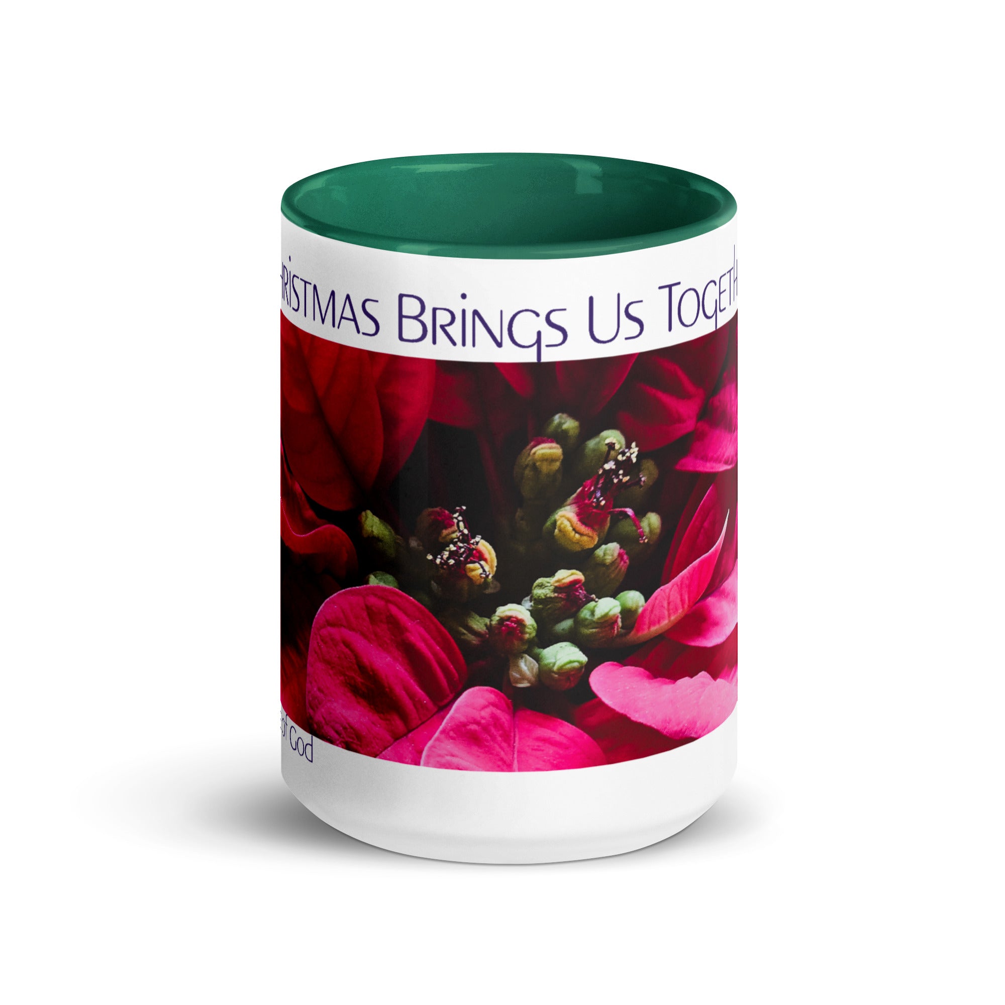 Celebrate togetherness with this heartwarming ceramic mug featuring Christmas Brings Us Together text and authentic poinsettia macro photography. The meaningful message honors family bonds and holiday connections that make the season special.