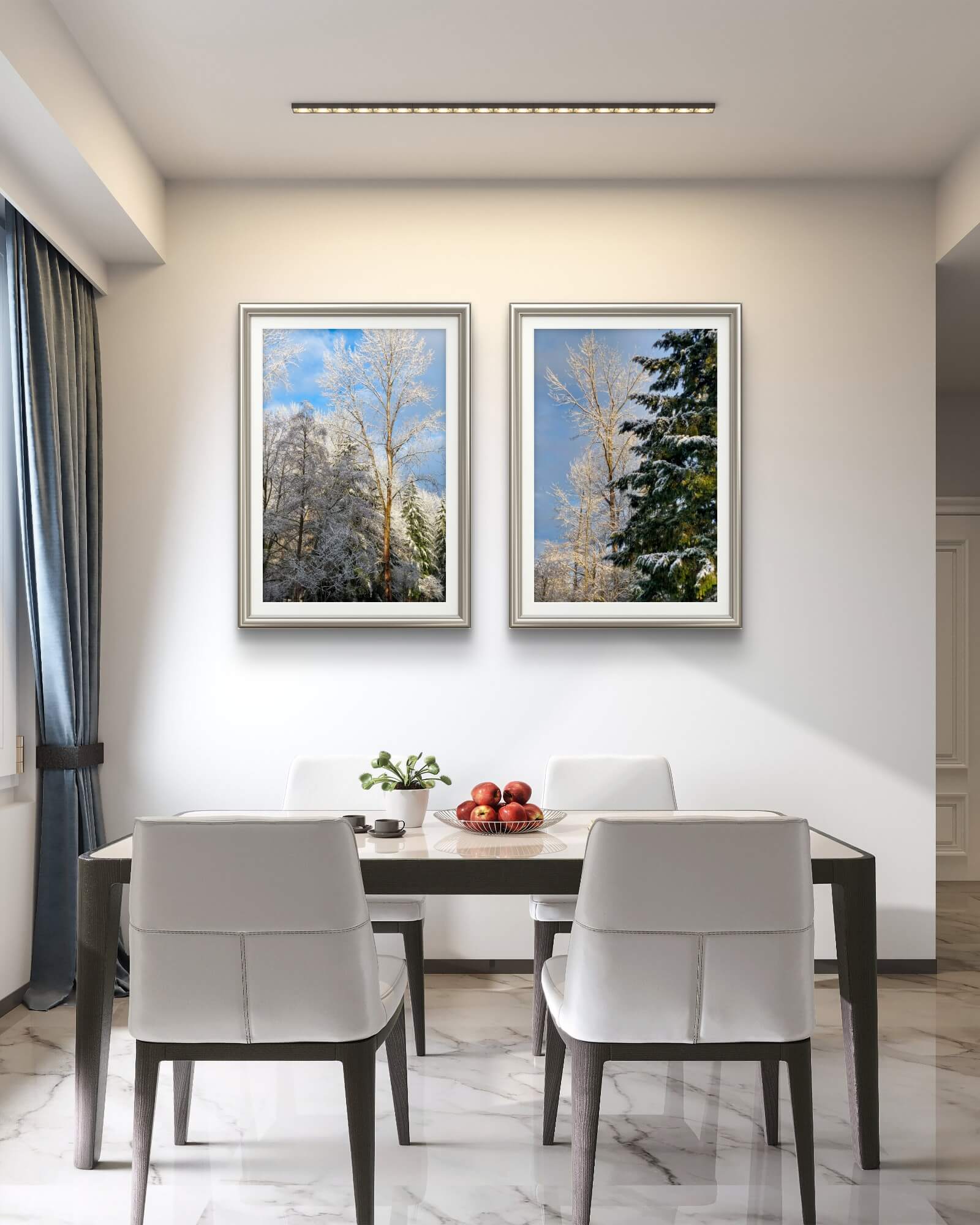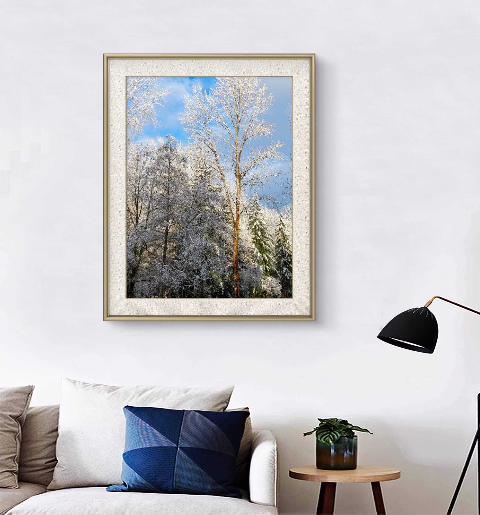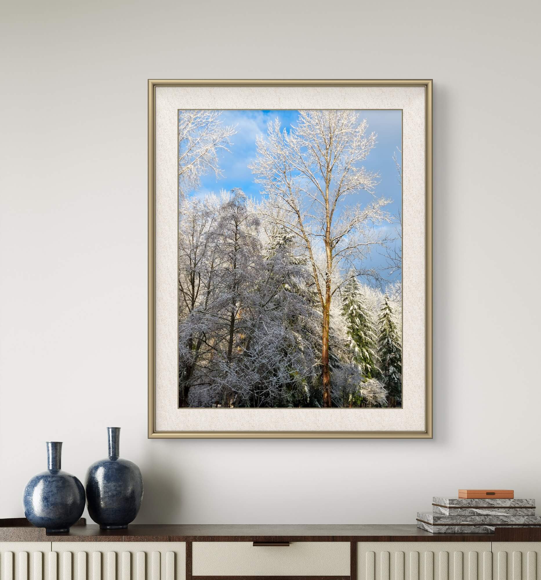 This exclusive 2-print set showcases towering frost-covered trees against brilliant blue winter skies, professionally photographed and printed on premium unstretched canvas. The vertical orientation creates dramatic visual impact, drawing the eye upward and making rooms feel more spacious and serene.
