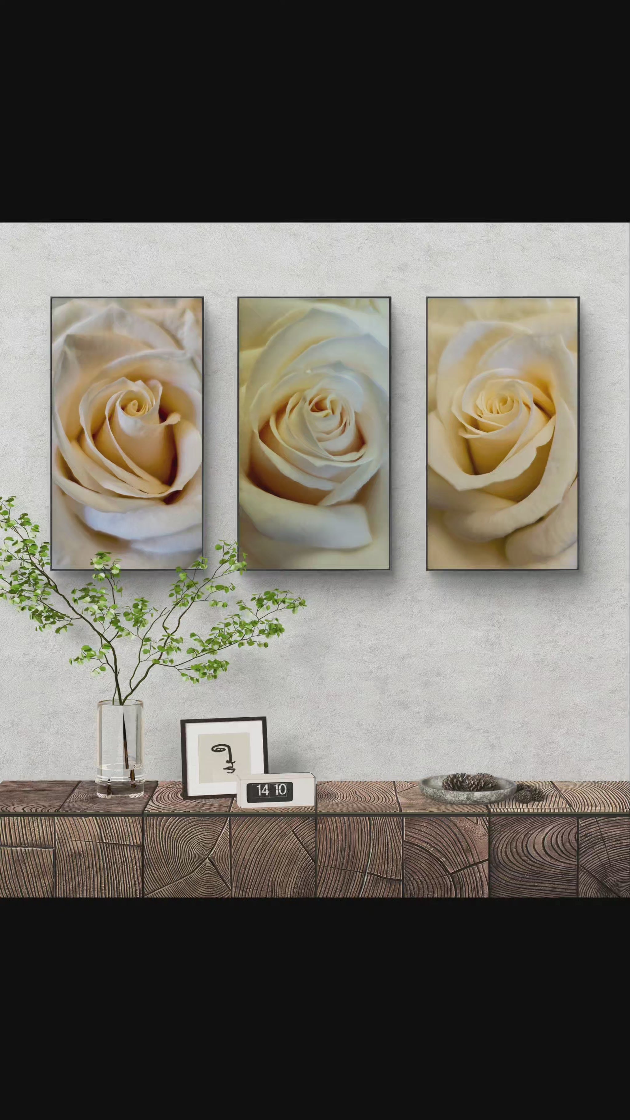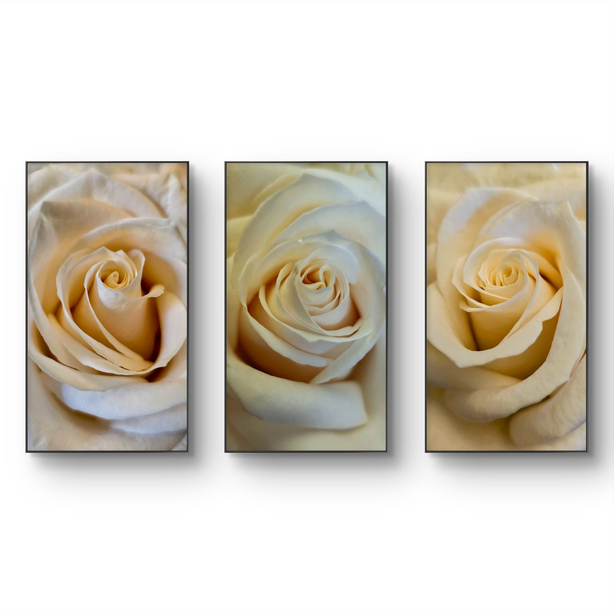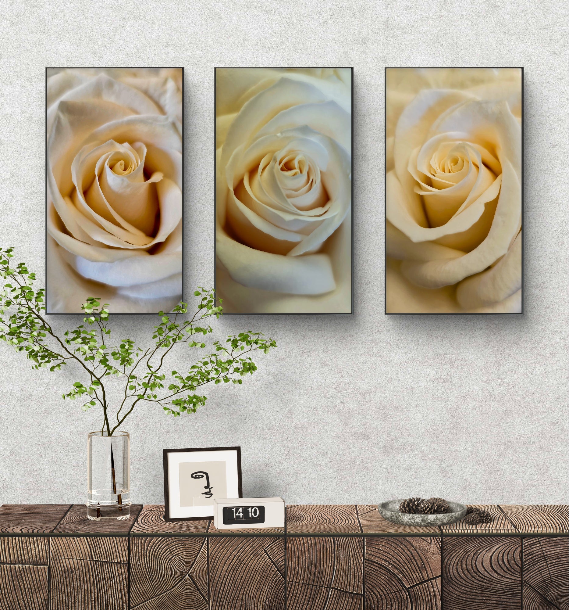 Embrace the gentle elegance of nature with this exquisite collection of three pale yellow roses canvas prints. Each vertical piece captures the delicate beauty of authentic roses in their natural habitat, showcasing soft petals kissed by morning light and the subtle textures that make each bloom unique.