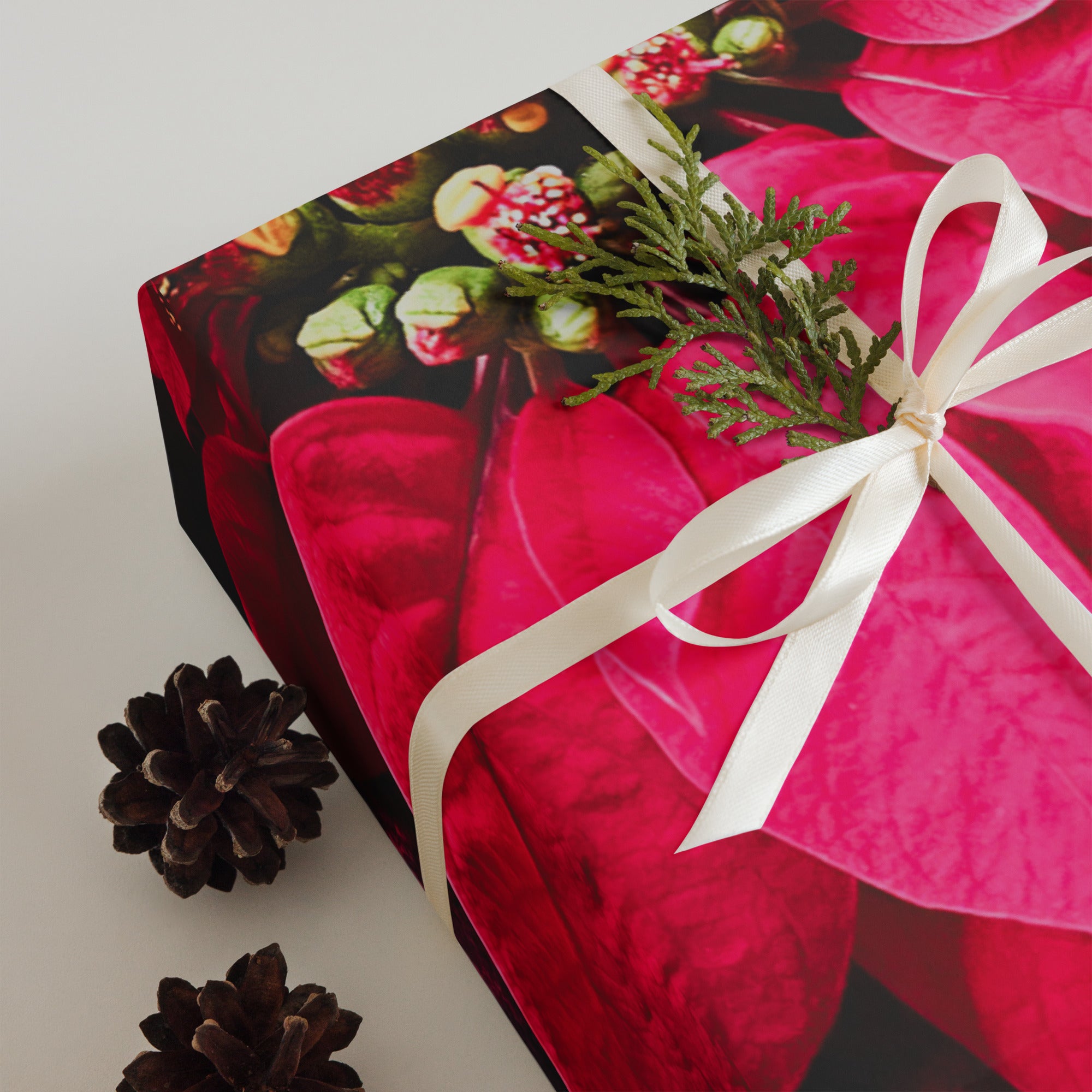 A: Strategic wrapping techniques highlight the botanical photography while creating beautiful presentation. Center the Subject: Position the most dramatic elements (full blooms or detailed centers) on top or front-facing surfaces of gifts. Avoid Fold Lines Through Faces: Plan folds to fall between design elements rather than across flower centers when possible. Consider Box Size: Match design scale to gift size - full blooms work on larger boxes, detail shots suit smaller packages. Layering Technique: Use solid coordinating paper underneath with poinsettia paper as decorative top layer or band. Directional Awareness: Pay attention to which direction flowers face - typically orient blooms upward or toward gift recipient. Minimal Embellishment: Let photography be the star - use simple natural twine, velvet ribbon, or greenery rather than competing decorations. Photography Display: If recipient appreciates photography, fold to feature best composition on most visible surface. Mixed Sheet Strategy: Use different designs for boxes going to same person for varied but coordinated presentation.