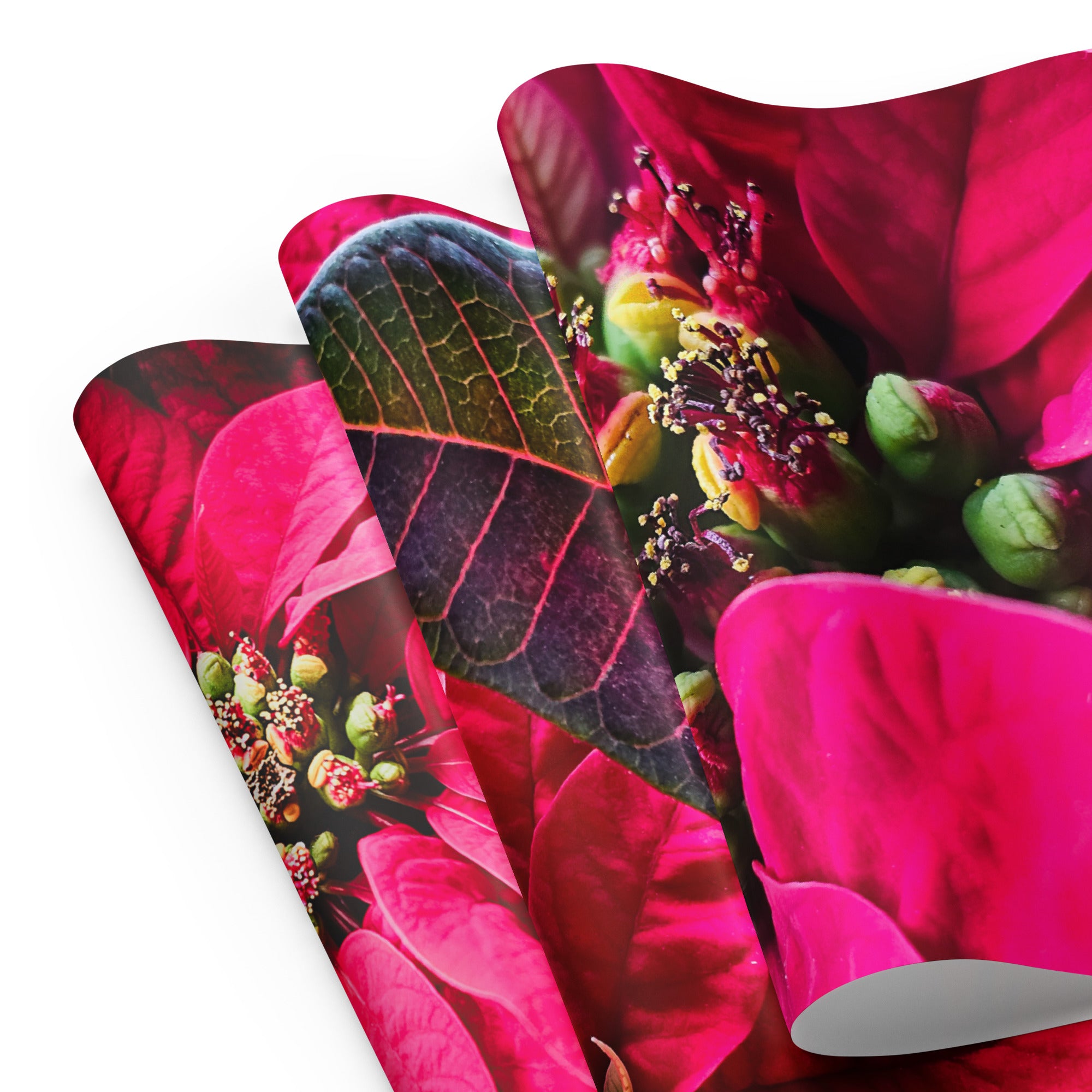 A: This wrapping paper features authentic macro photography rather than illustrated or generic designs, offering several unique advantages. Photographic Authenticity: Real poinsettia flowers captured through professional macro lens work reveal genuine botanical details - intricate stamen structures, natural color variations, and authentic leaf vein patterns. Artistic Quality: Functions as gift wrap and decorative paper suitable for framing, crafting, or display after unwrapping. Sophisticated Design: Appeals to adults and design-conscious gift-givers seeking elevated presentation beyond cartoon or simplistic holiday patterns. Nature Connection: Celebrates actual botanical beauty rather than stylized representations. Conversation Value: Recipients often comment on the exceptional photography and detail quality. Reusability: High-quality paper and timeless botanical imagery encourage saving for crafts, scrapbooking, or future use.