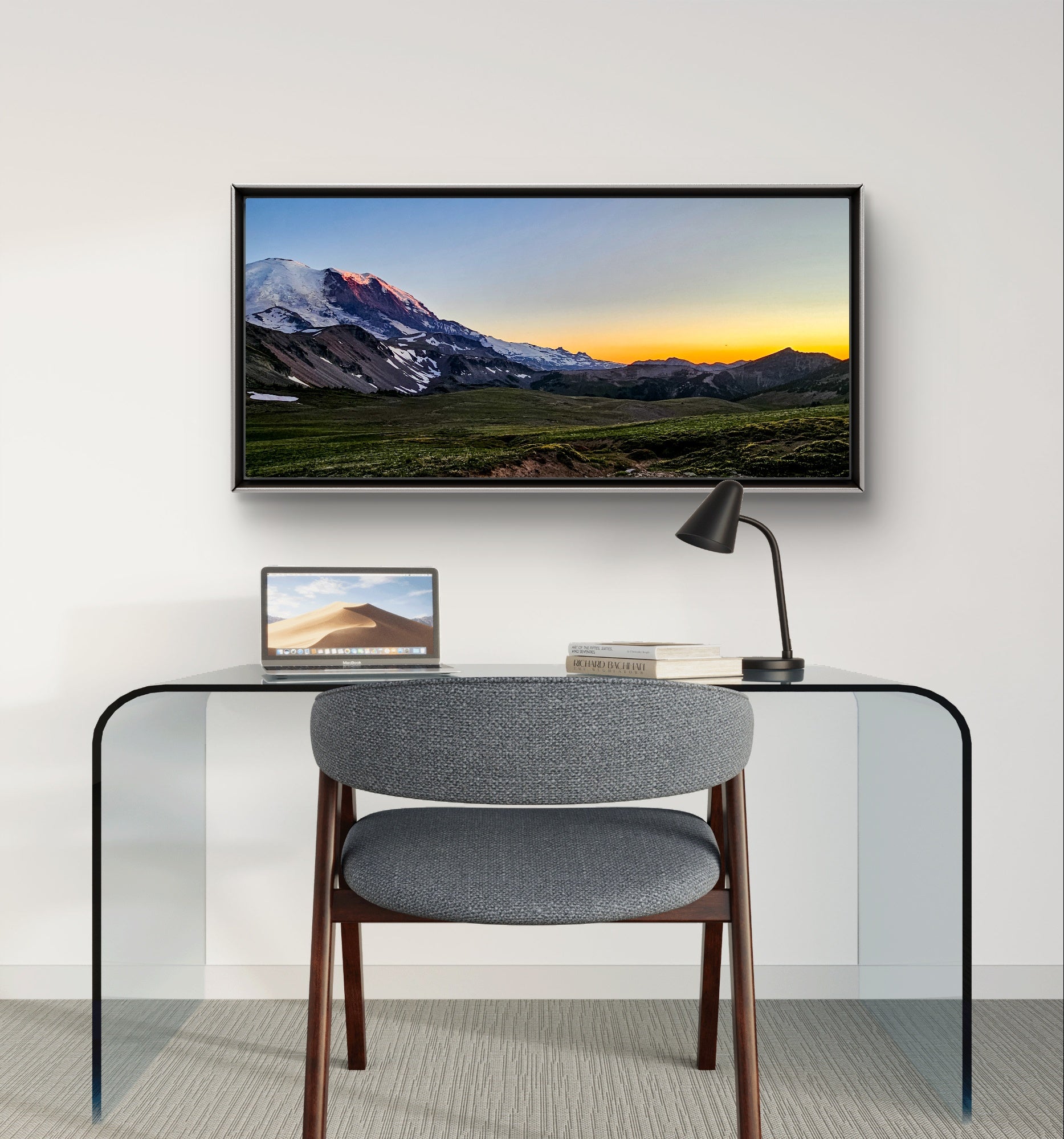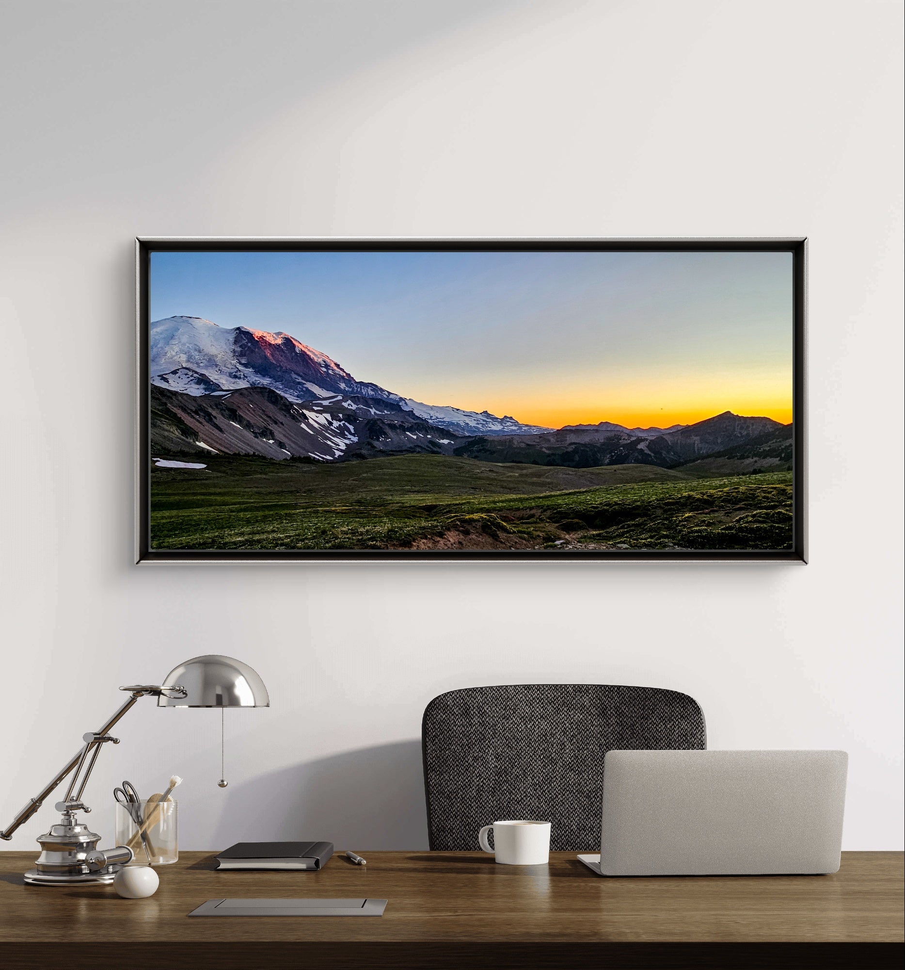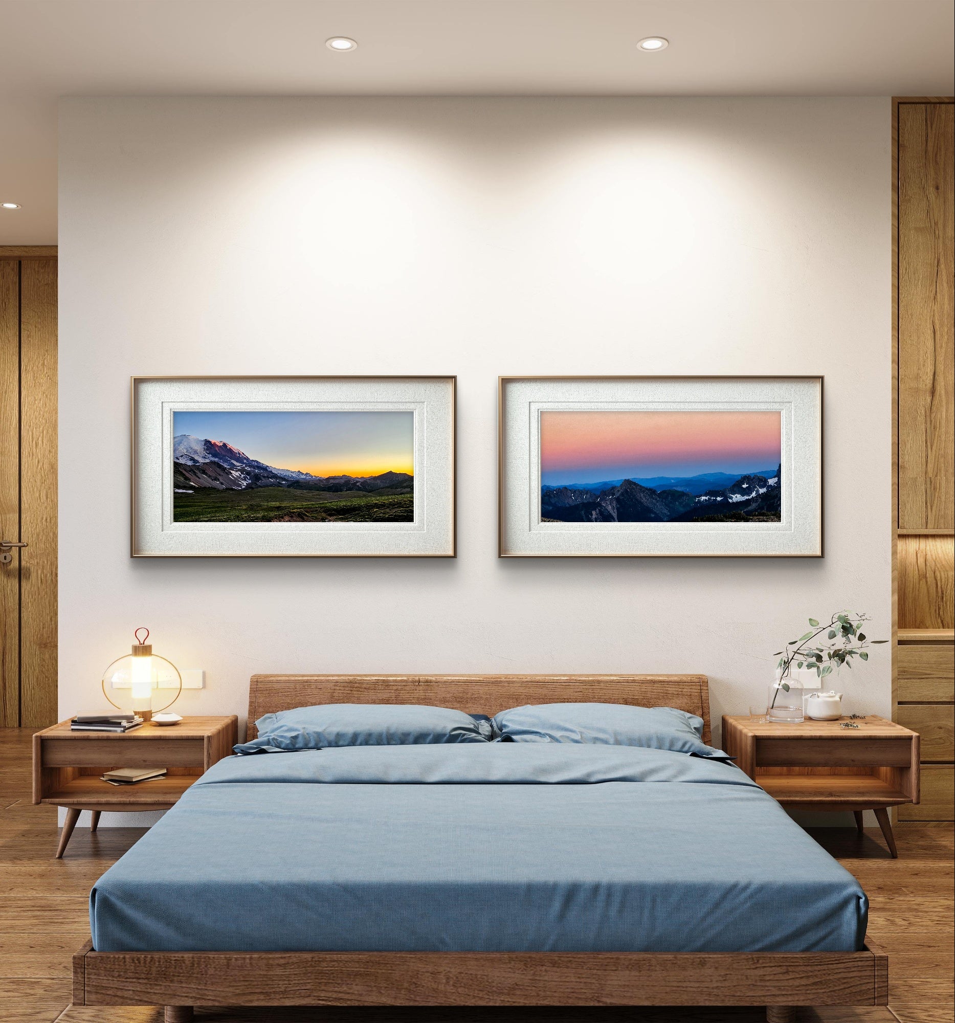 A: Mount Rainier sunset photography features warm golds, soft pink and blue, and deep grays that complement most color schemes. These natural earth tones pair beautifully with rustic wood, neutral grays and whites, and other mountain-inspired palettes. The golden sunset tones add warmth to any room while the mountain blues provide calming balance.