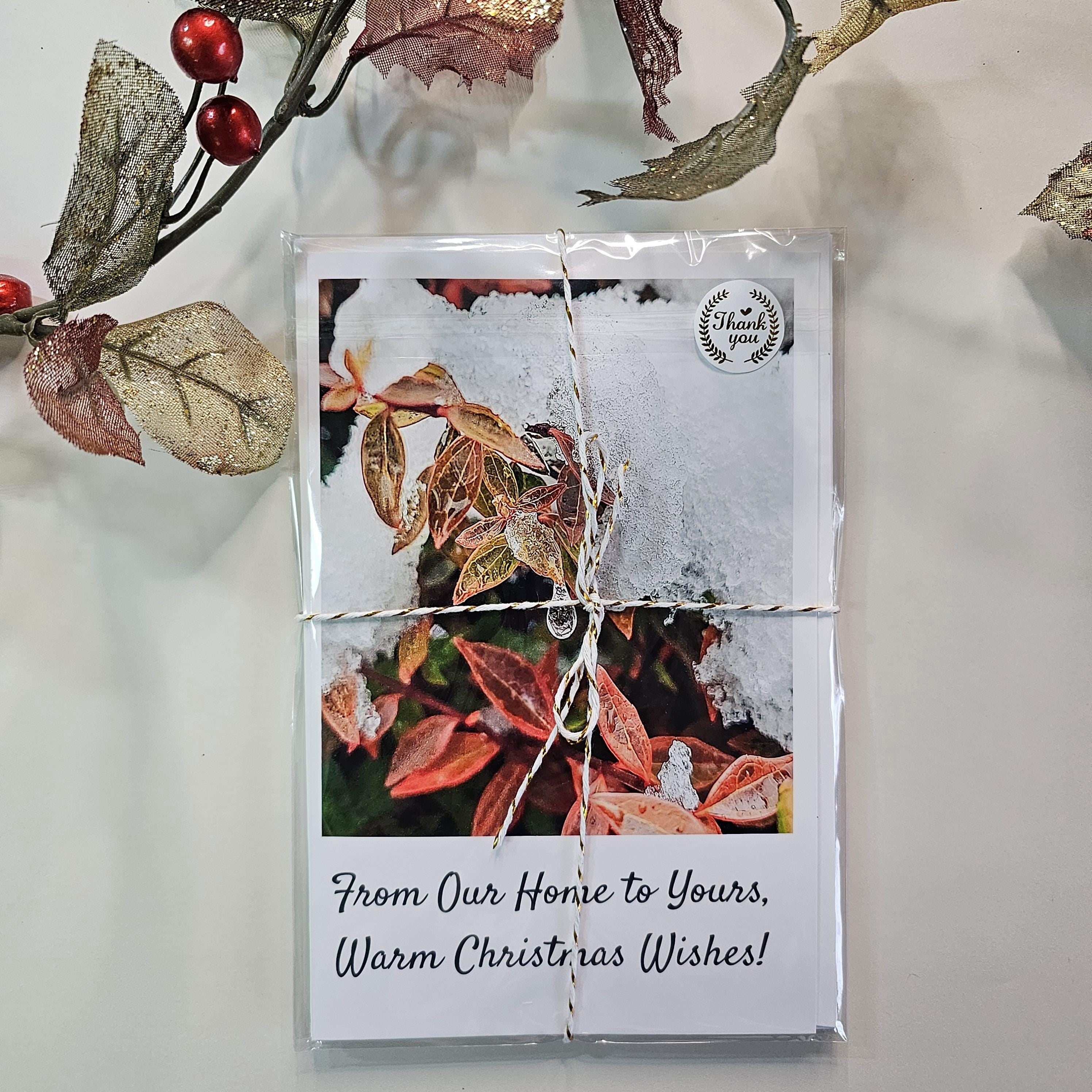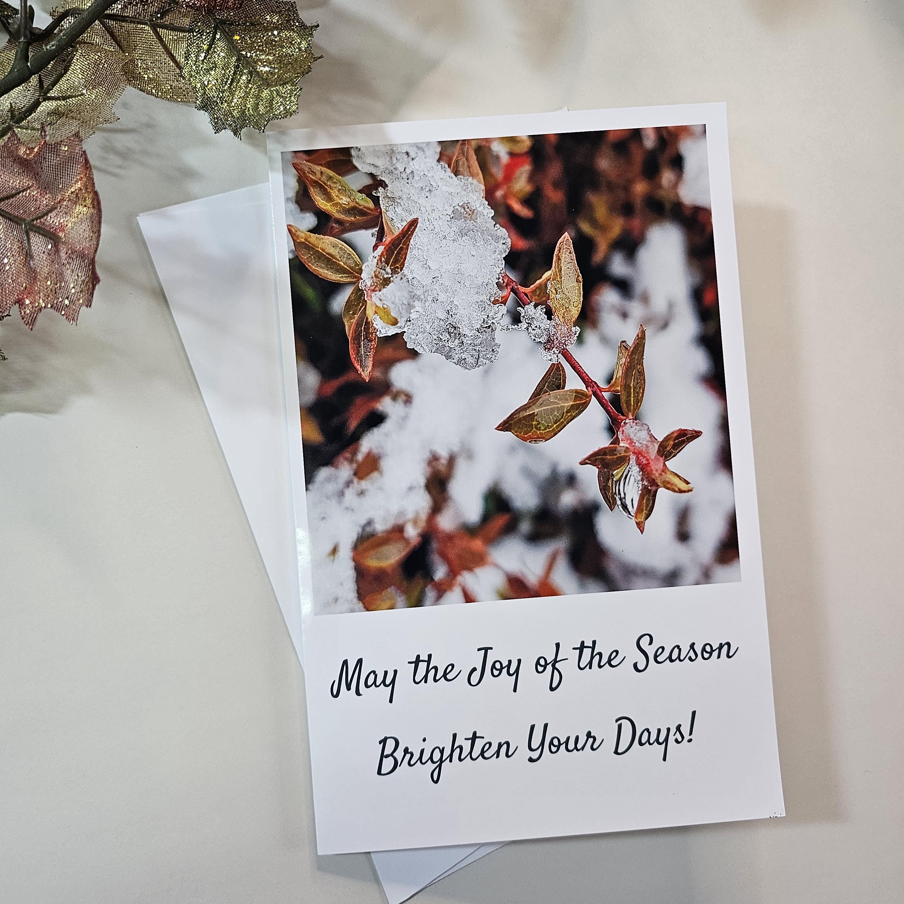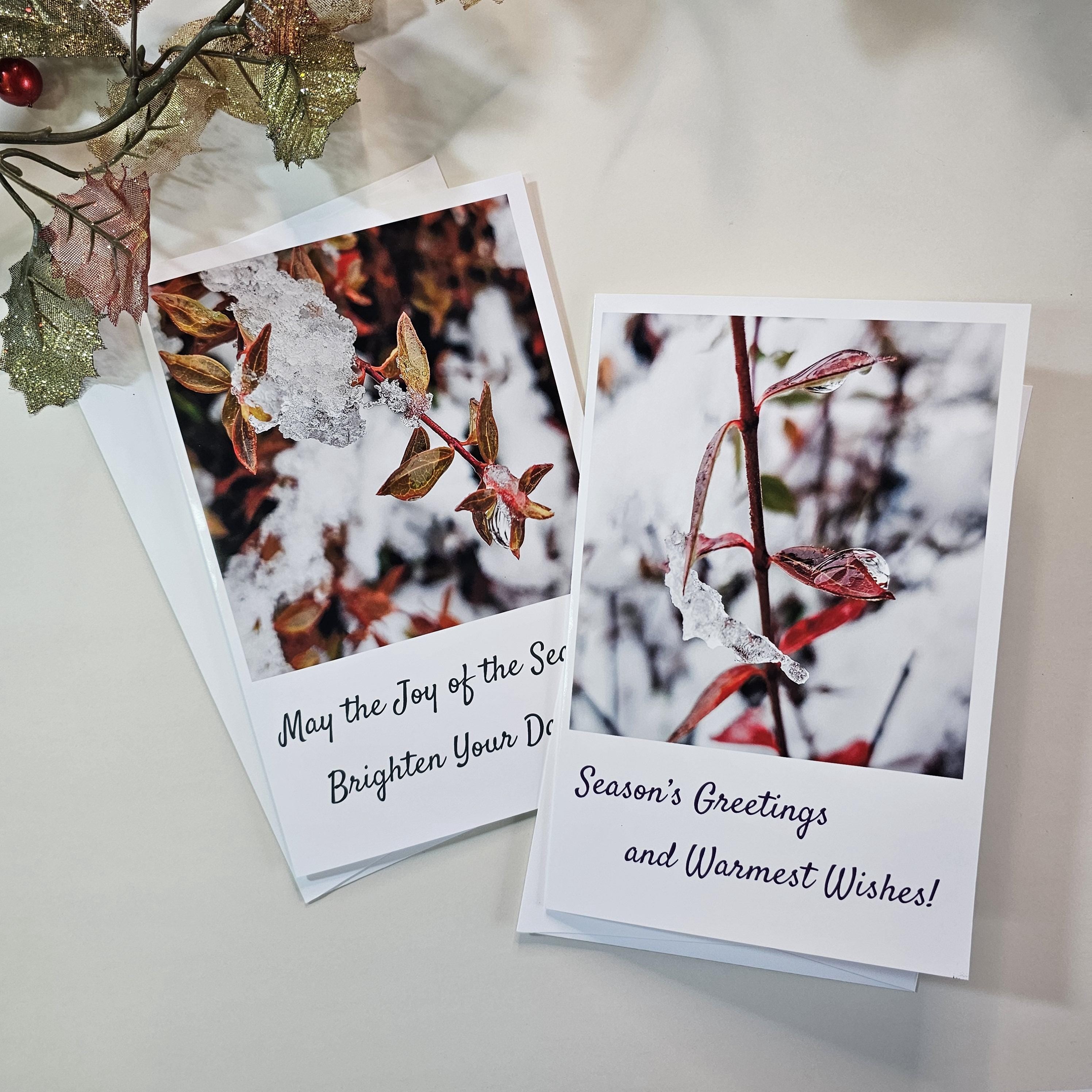 - 4 unique greeting cards with different snow-covered foliage photographs with season greetings and Christmas wishes text