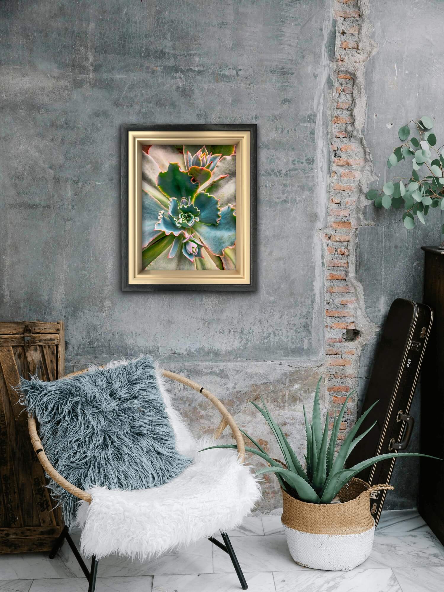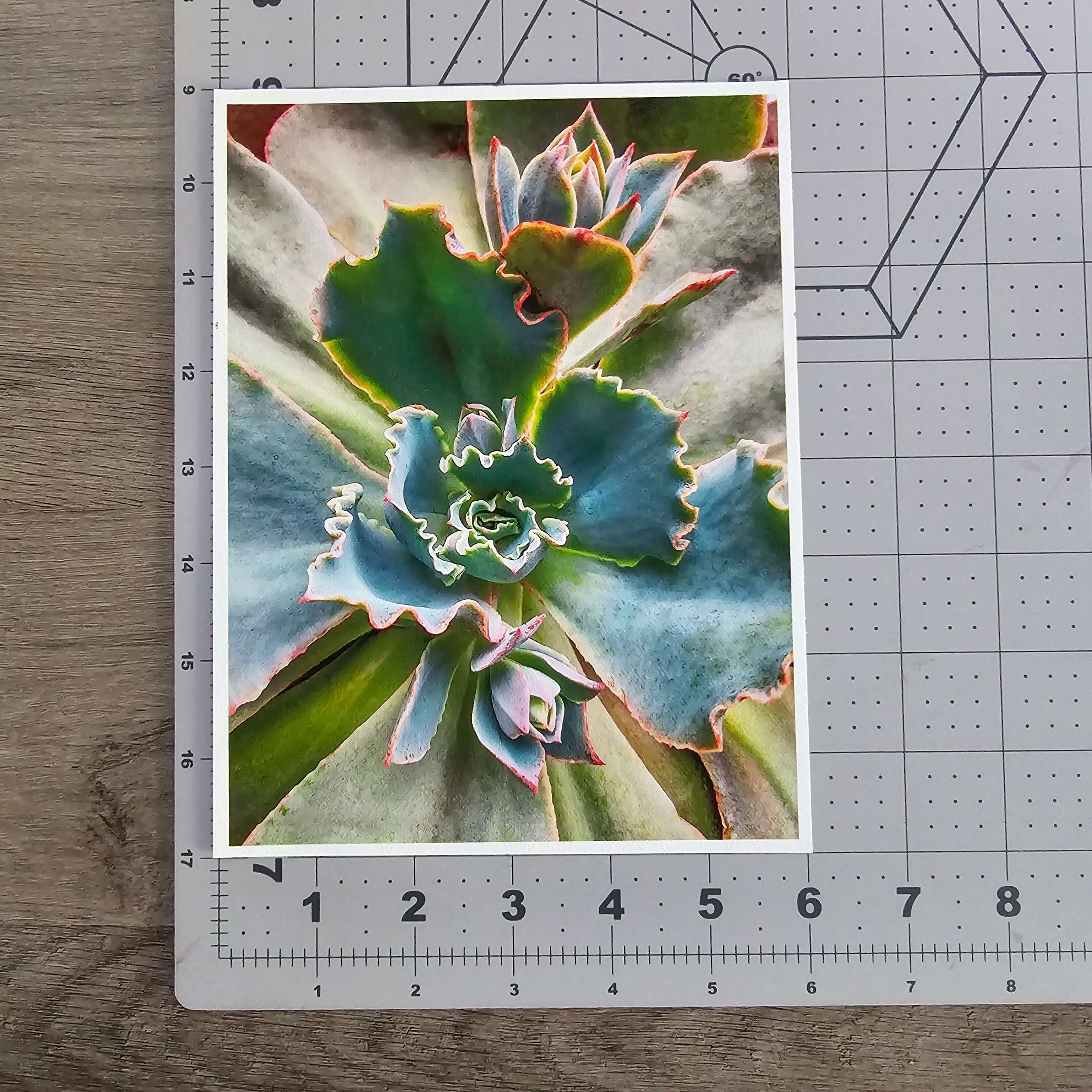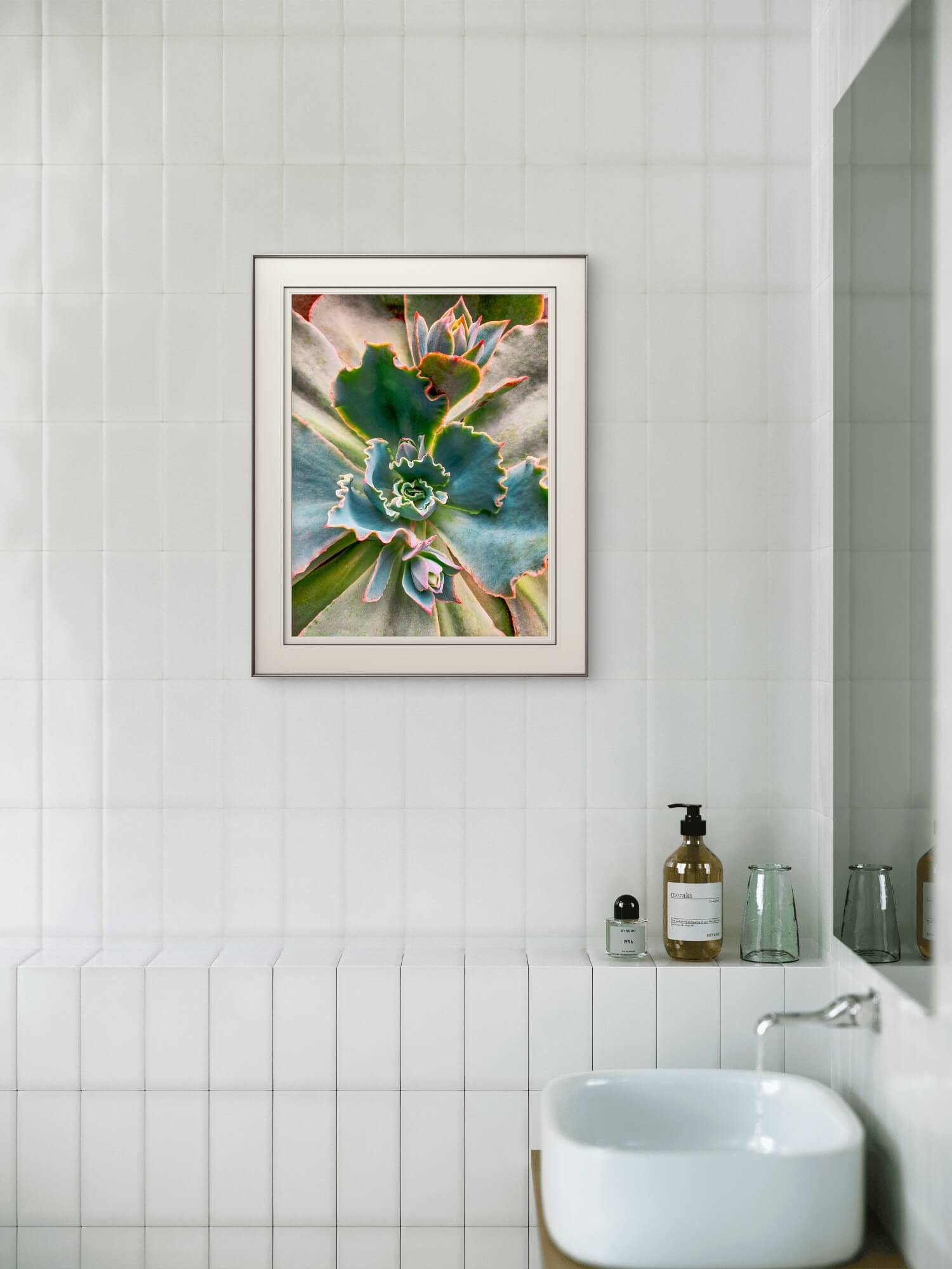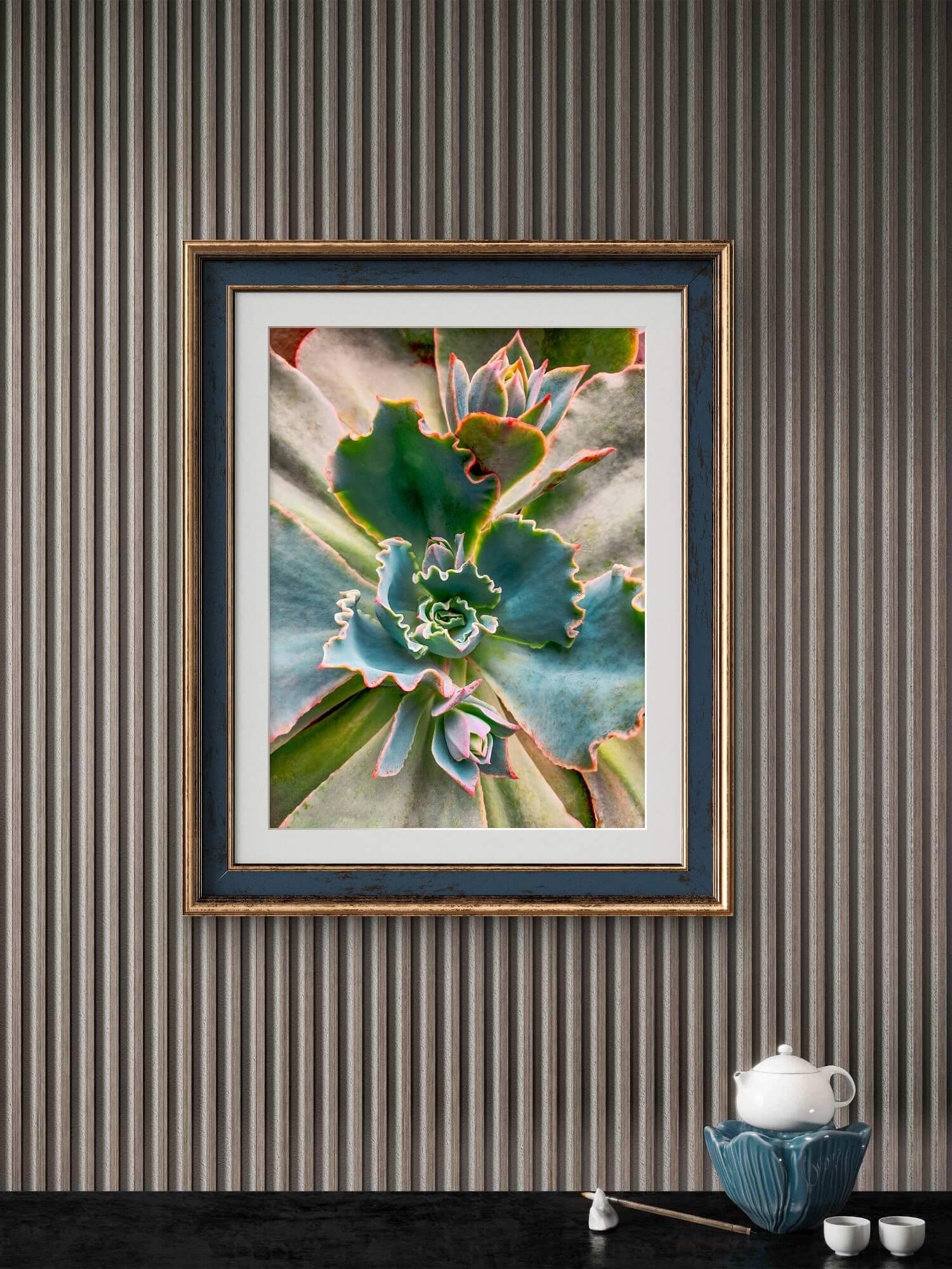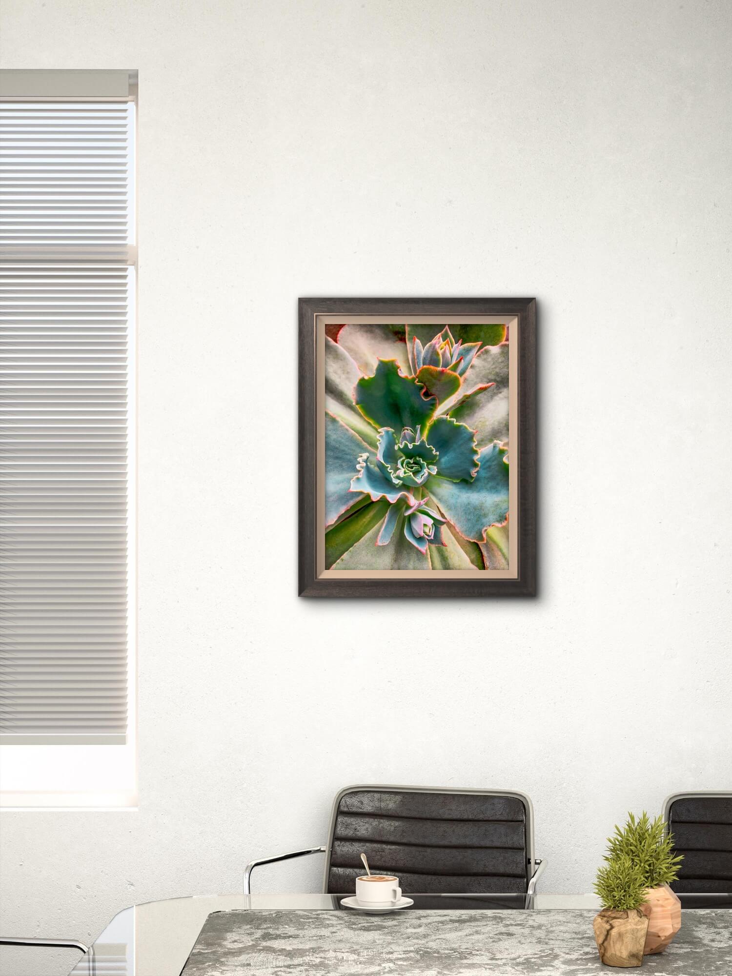 Most wall art announces itself immediately and then fades into the background. This one reveals more detail the closer you stand — the waxy texture of each leaf, the way ruffled edges catch light at different angles, the precise crimson line tracing each margin. It works for the nature lover, the geometry lover, and anyone who simply needs something calming on their wall.