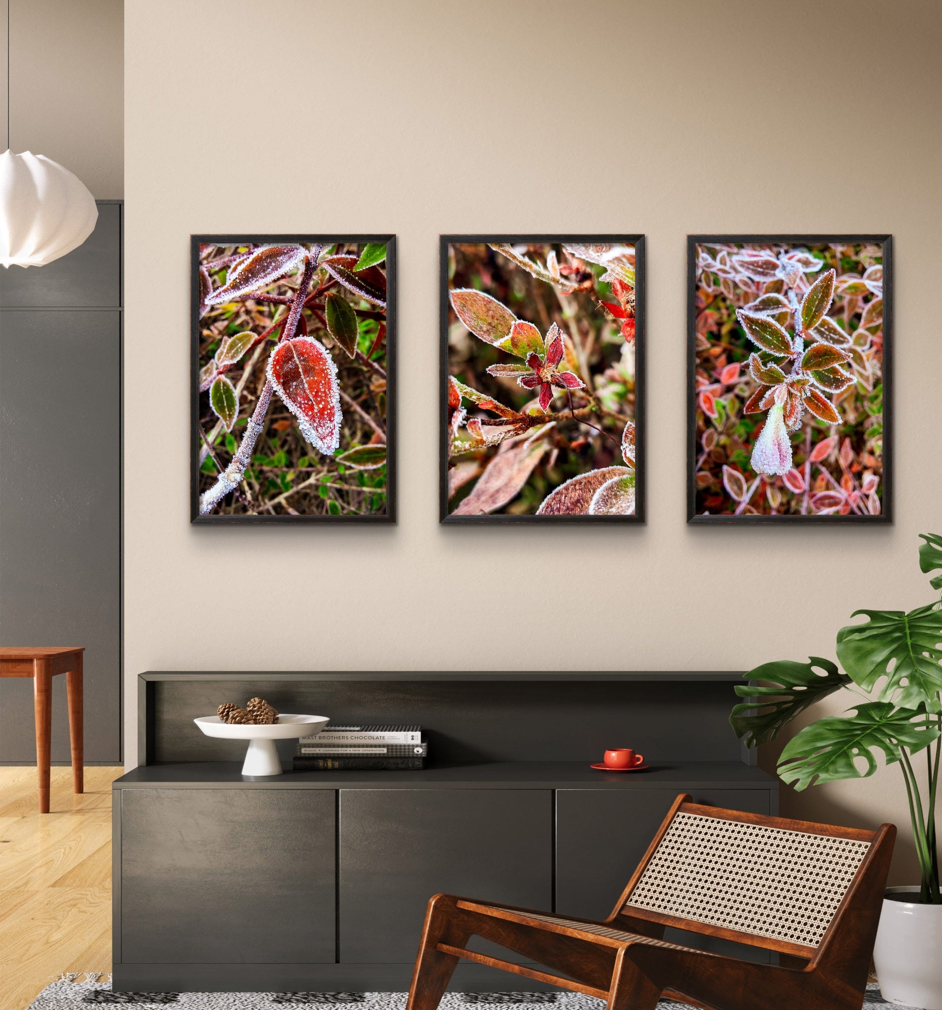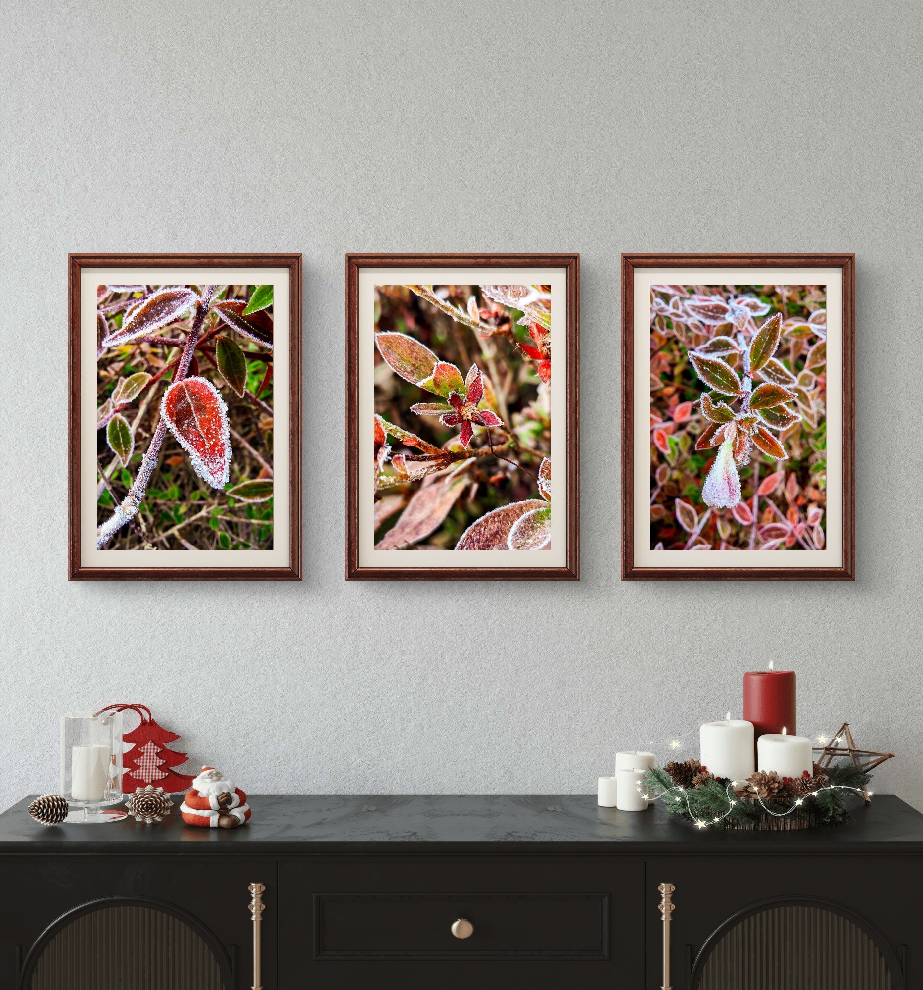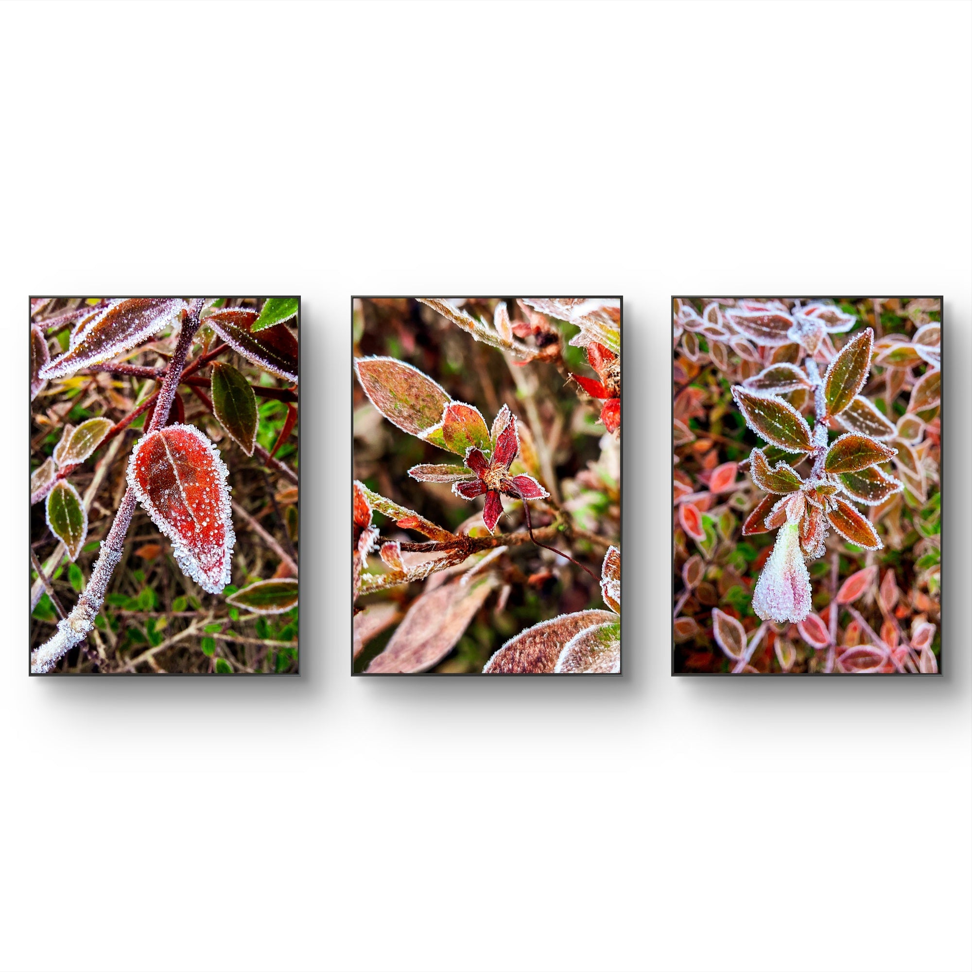 These aren't stock photos or digitally created images. Each print in this vertical 3-piece set showcases real frost crystals forming on burgundy and green leaves, photographed during Washington State's fleeting winter mornings when temperatures hover just below freezing. Using professional macro lenses, I've revealed nature's hidden artistry: the delicate ice crystal formations, the way frost outlines each leaf edge, and the stunning interplay of warm burgundy tones against cool white frost.