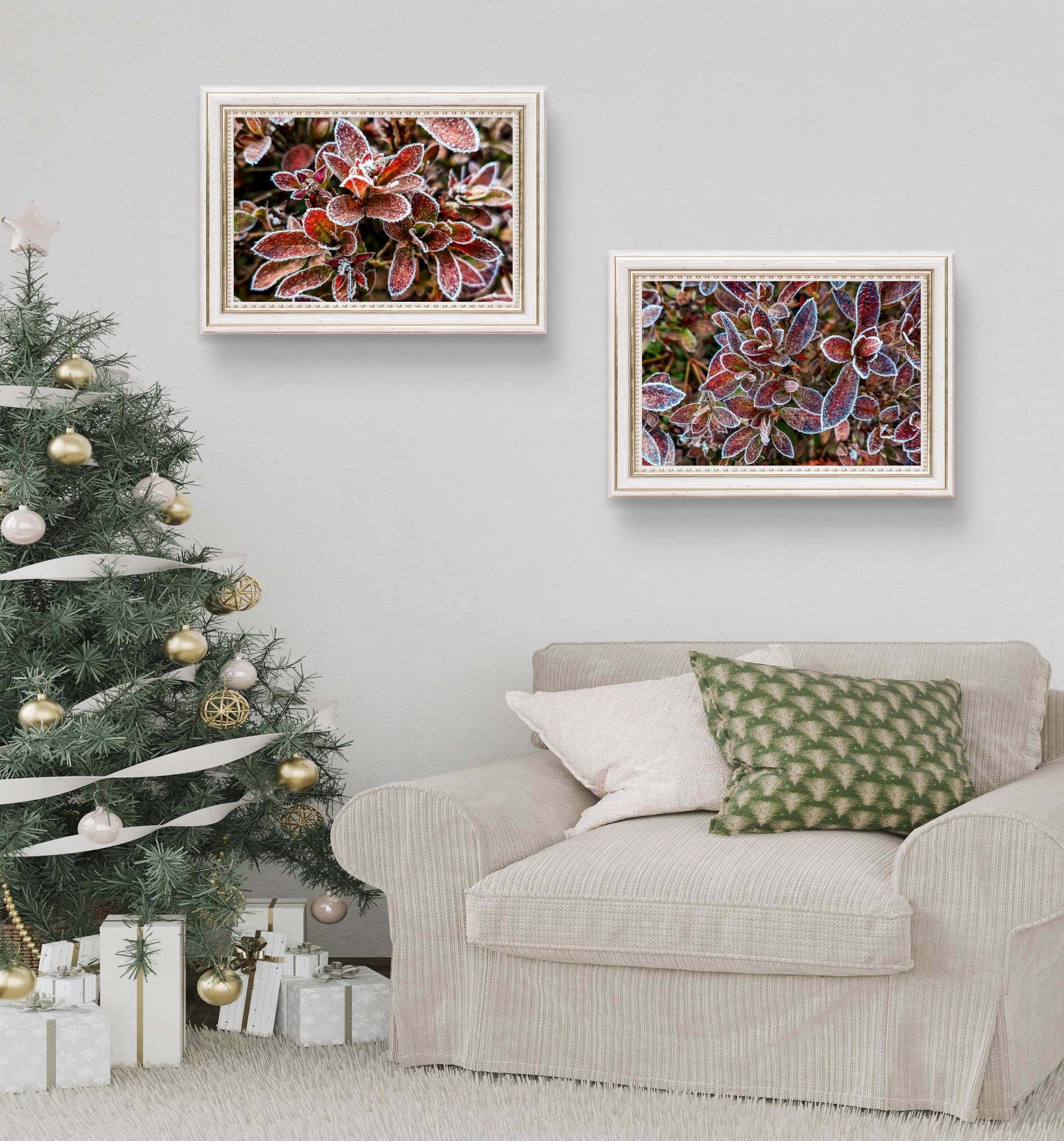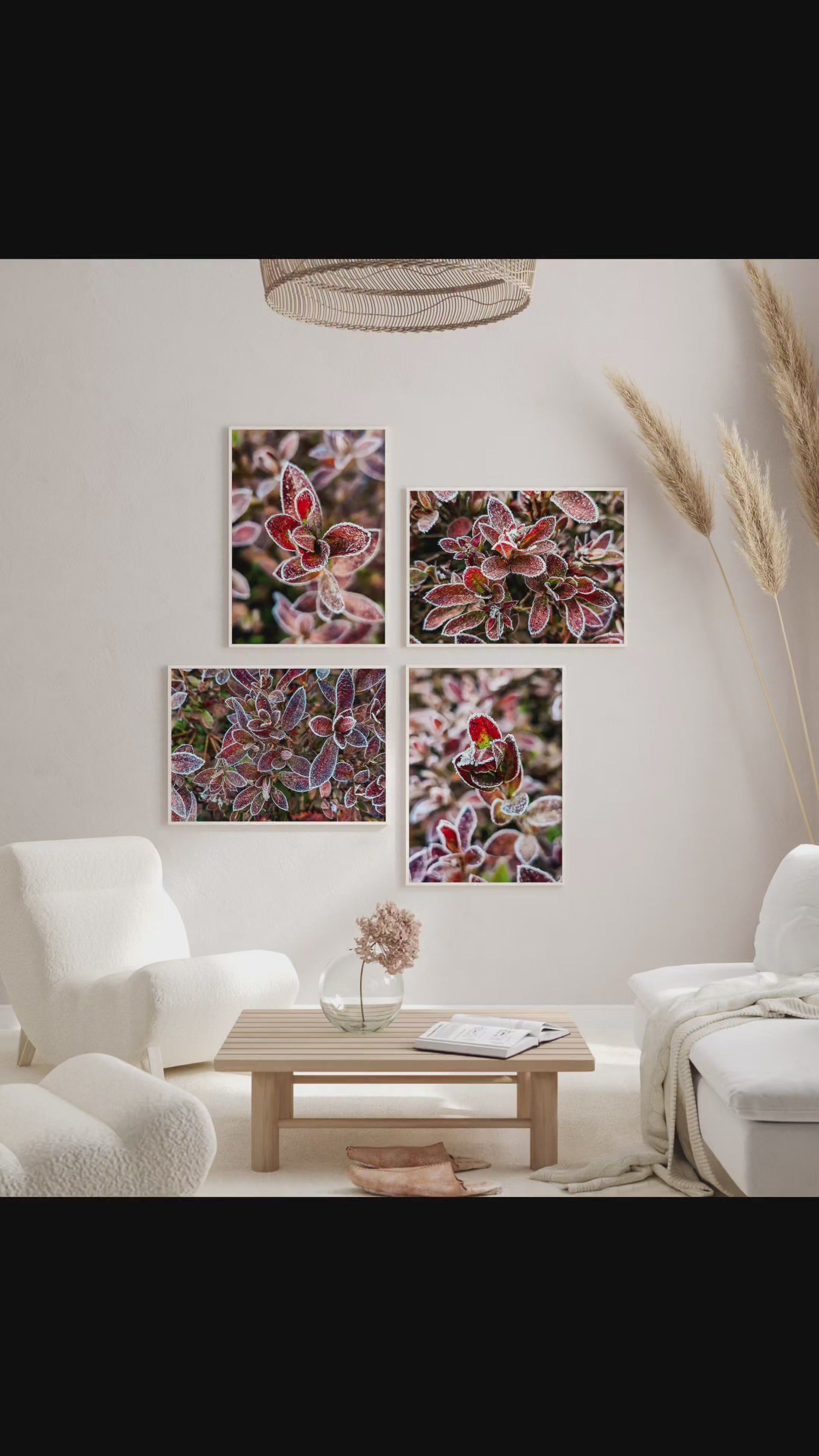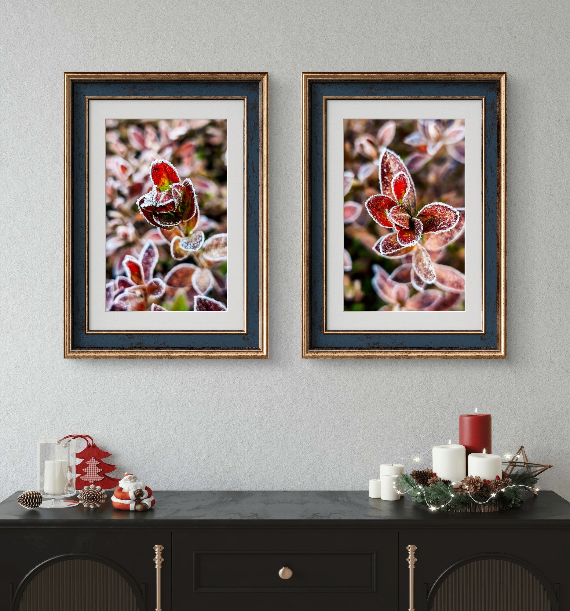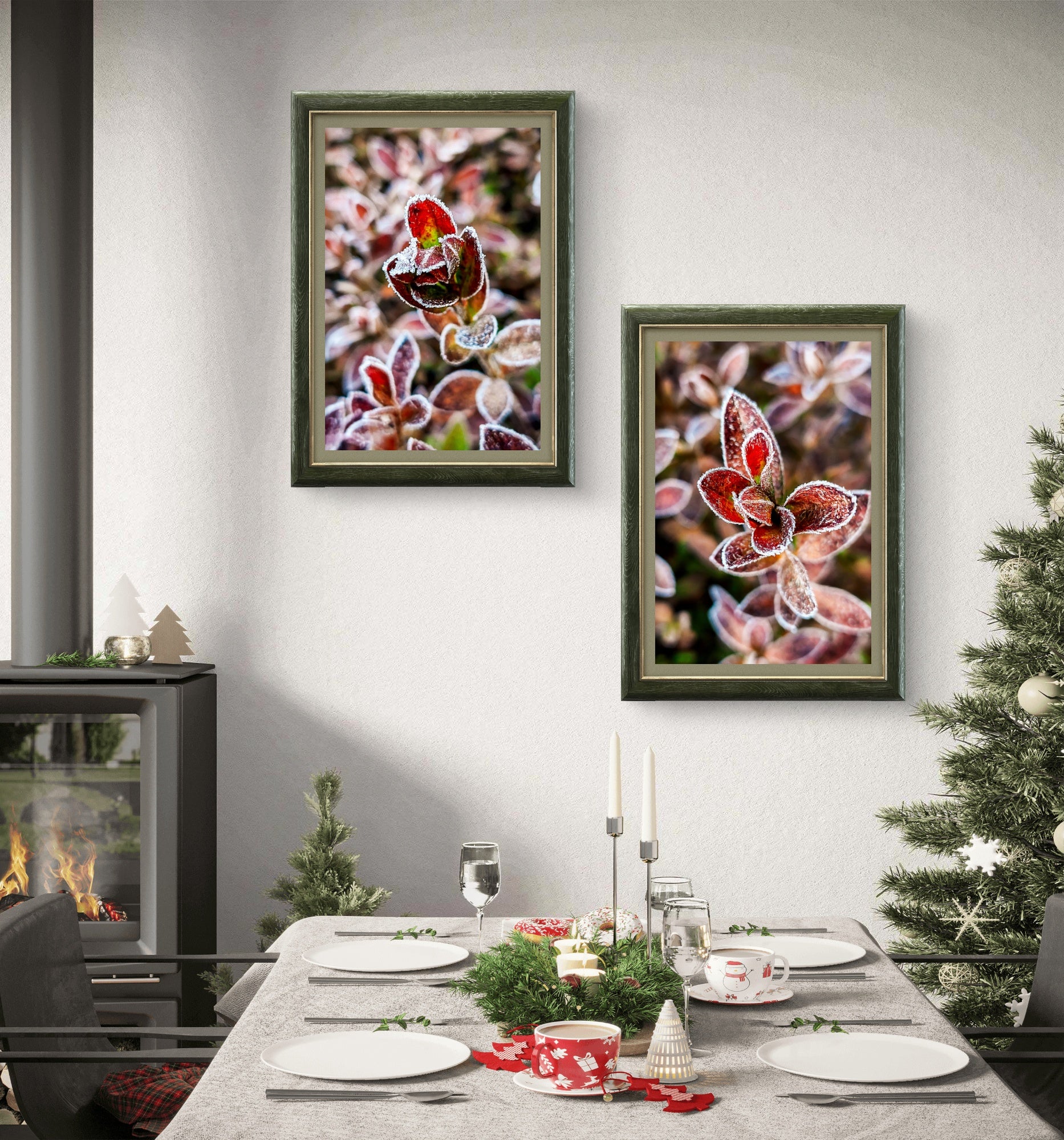 This set includes four high-quality unframed canvas prints: two vertical and two horizontal orientations for versatile styling. The rich red, burgundy, and purple tones with delicate frost detailing add warmth and depth to modern farmhouse, Scandinavian, rustic, or contemporary interiors. Whether displayed as a gallery wall or distributed throughout your home, these prints tell a cohesive visual story.