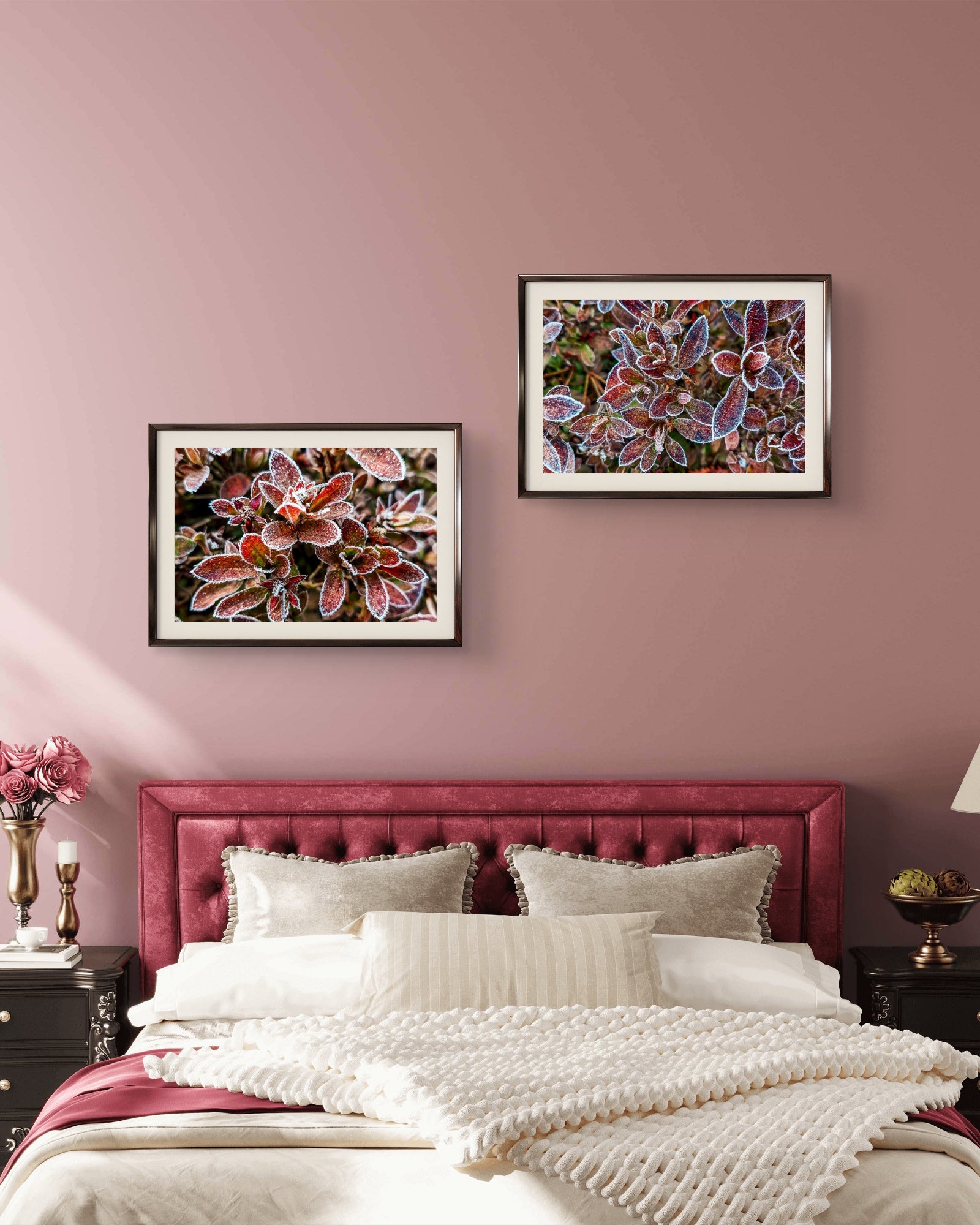 A: Absolutely! The rich burgundy and purple tones with natural frost detailing are incredibly versatile. They complement modern, farmhouse, Scandinavian, rustic, bohemian, and contemporary interiors beautifully. The nature subject matter and color palette add warmth without overwhelming your existing style.