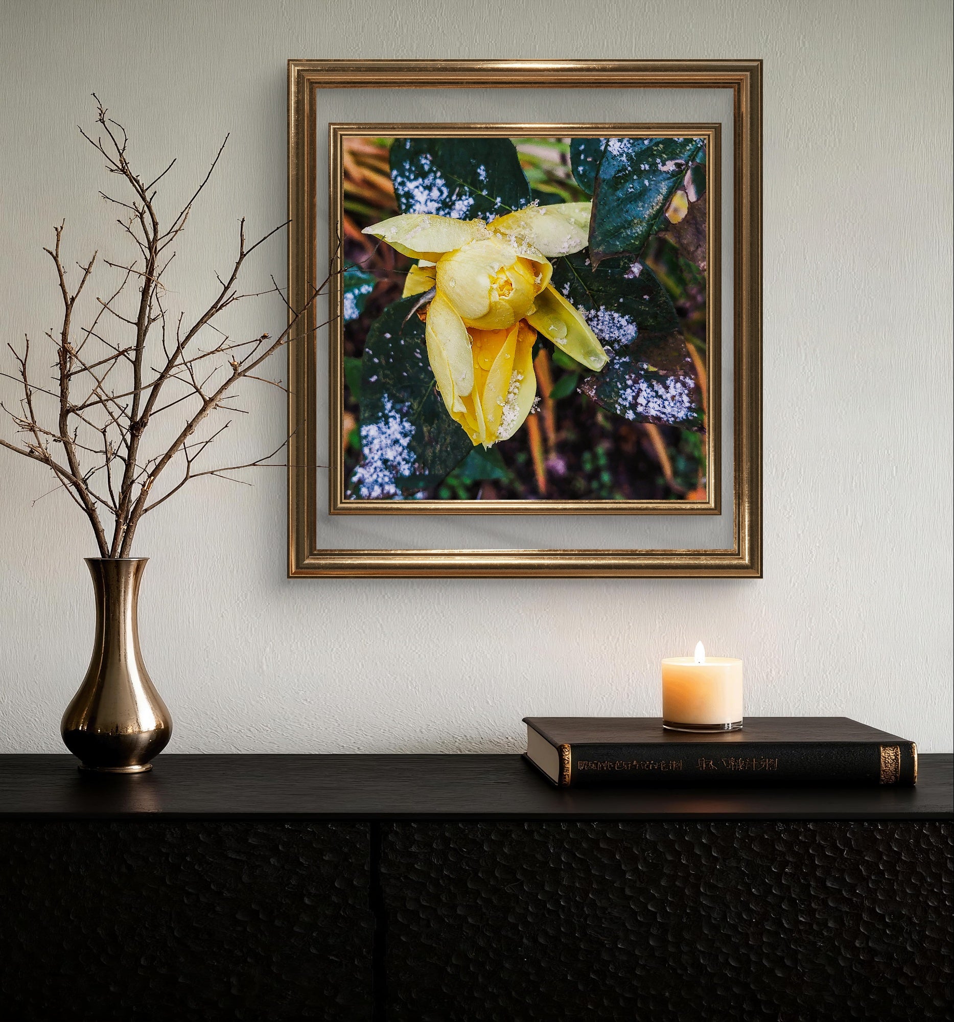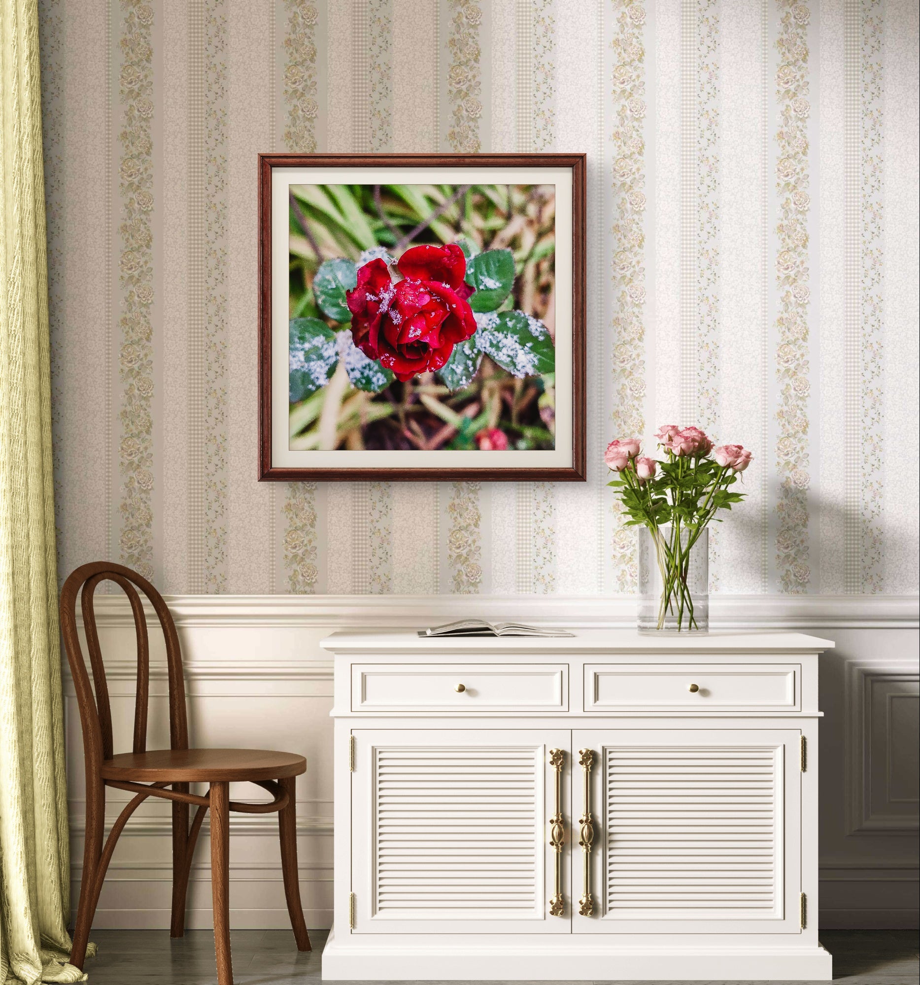 A: Unstretched format offers specific advantages for preserving the intricate details in these macro photographs. Shipping Protection: Flat packaging prevents any corner damage that might affect the delicate ice crystal details visible in photographs. Detail Preservation: Glass framing option allows closest viewing of intricate frost patterns without dust accumulation on canvas surface. Color Protection: Glass also protects the vibrant red and yellow pigments from environmental exposure. Flexibility: Choose between traditional framing (better for detail appreciation and protection) or stretching (gallery-style presentation). Storage Convenience: If rotating seasonally, unstretched canvas stores flat easily during off-season months. Budget Control: Invest at your comfort level - simple frames work beautifully or upgrade to professional stretching. Customization: Work with framers for mat colors that enhance the roses (white mats echo snow, black creates drama, red coordinates with petals).