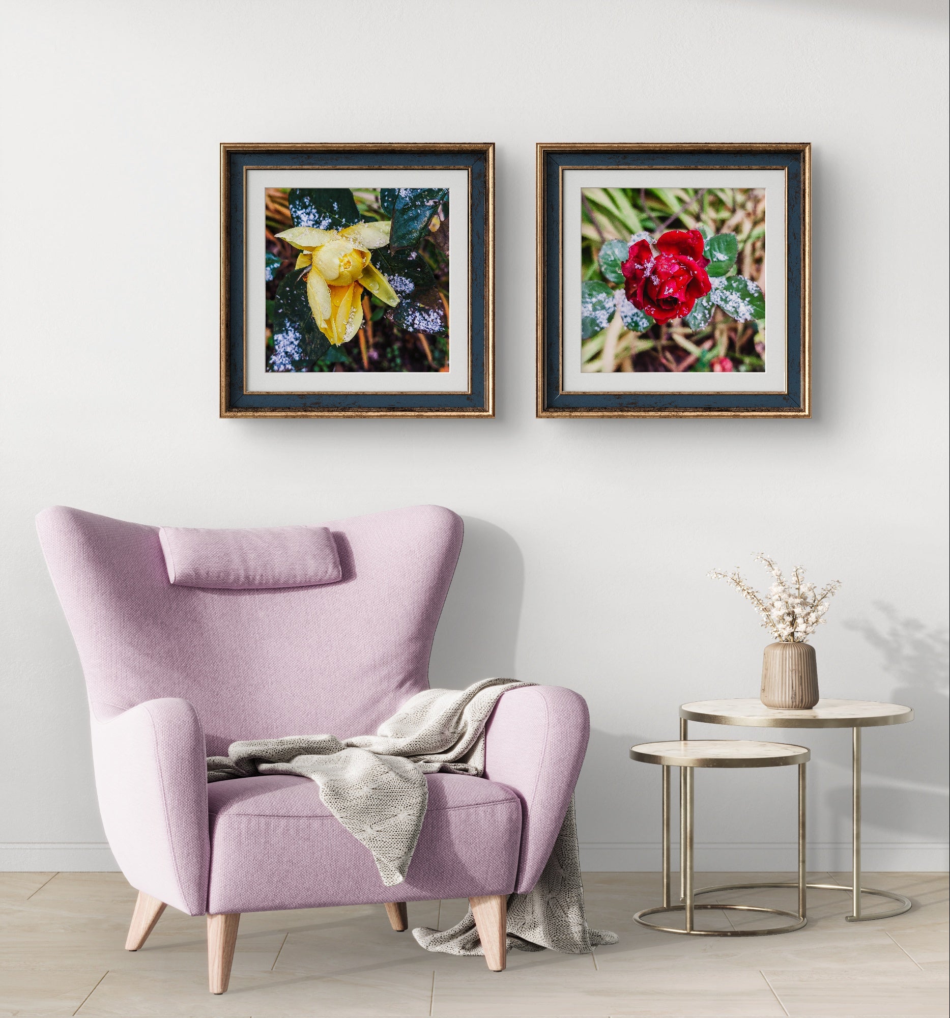 A: You receive two unstretched canvas prints in square format in your selected size. Each features one curated winter frozen rose macro photograph showcasing the red-yellow-green-white color palette. Canvases arrive carefully rolled or flat-packed in protective packaging for shipping safety. Not Included: Framing materials, stretcher bars, hanging hardware, mounting supplies, or display systems. This allows complete customization to match your specific vision and budget. Display Options: (1) Purchase standard square picture frames from craft stores like Michaels or Hobby Lobby - available in all offered sizes. (2) Have professionally stretched at local frame shops - typically $15-40 per piece depending on size and location. (3) Work with custom framers for specialized matting (white enhances snow, red coordinates with petals), unique frame styles (ornate for traditional, sleek for modern), or museum-quality mounting. Hardware: Standard picture hanging wire, sawtooth hangers, or command strips work depending on wall type and final frame weight.