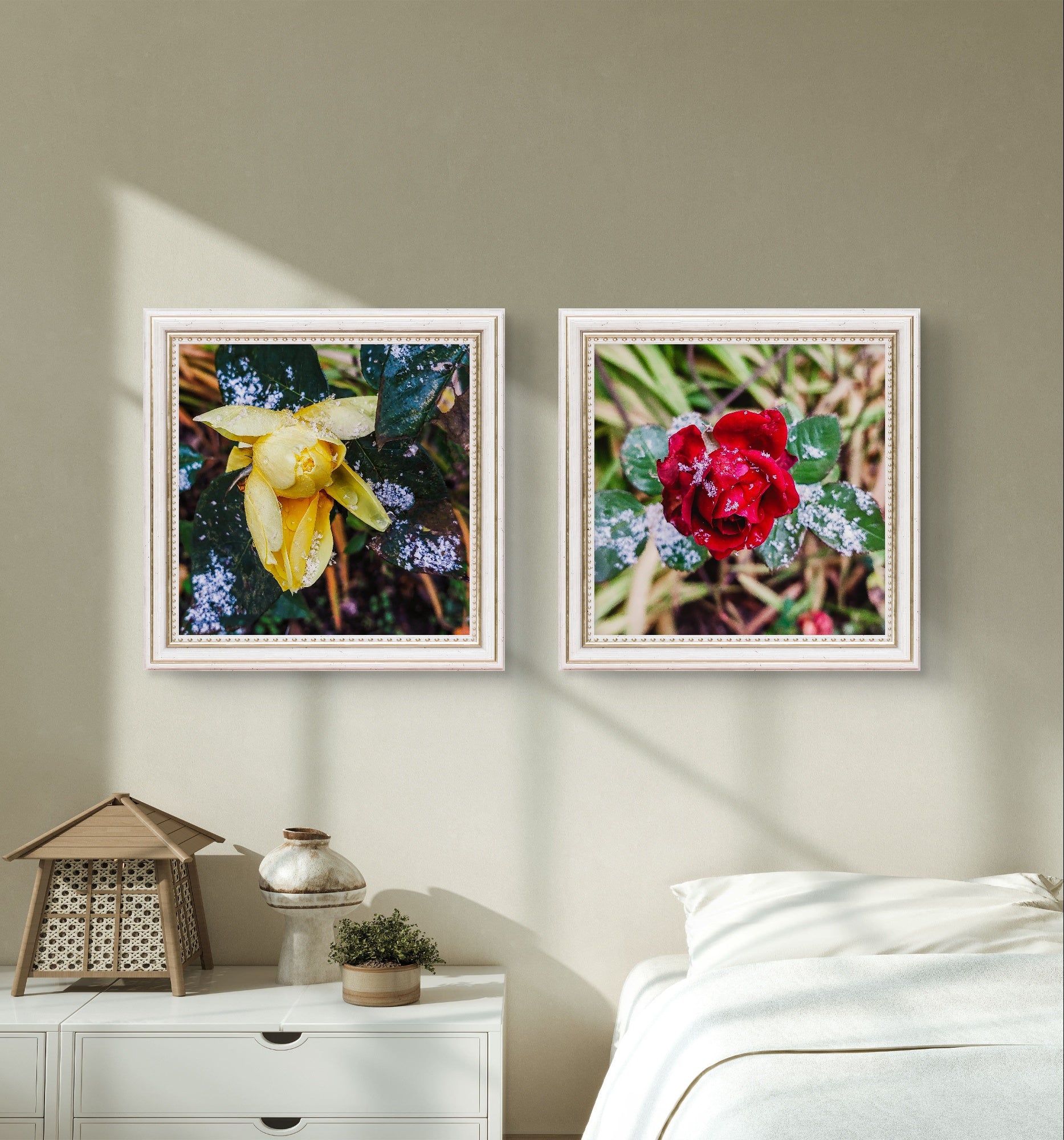 Discover winter's delicate beauty through this stunning two-piece square collection featuring authentic macro photography of red and yellow roses adorned with pristine white snow crystals. Each frost-kissed bloom reveals nature's resilience and extraordinary beauty during cold months.