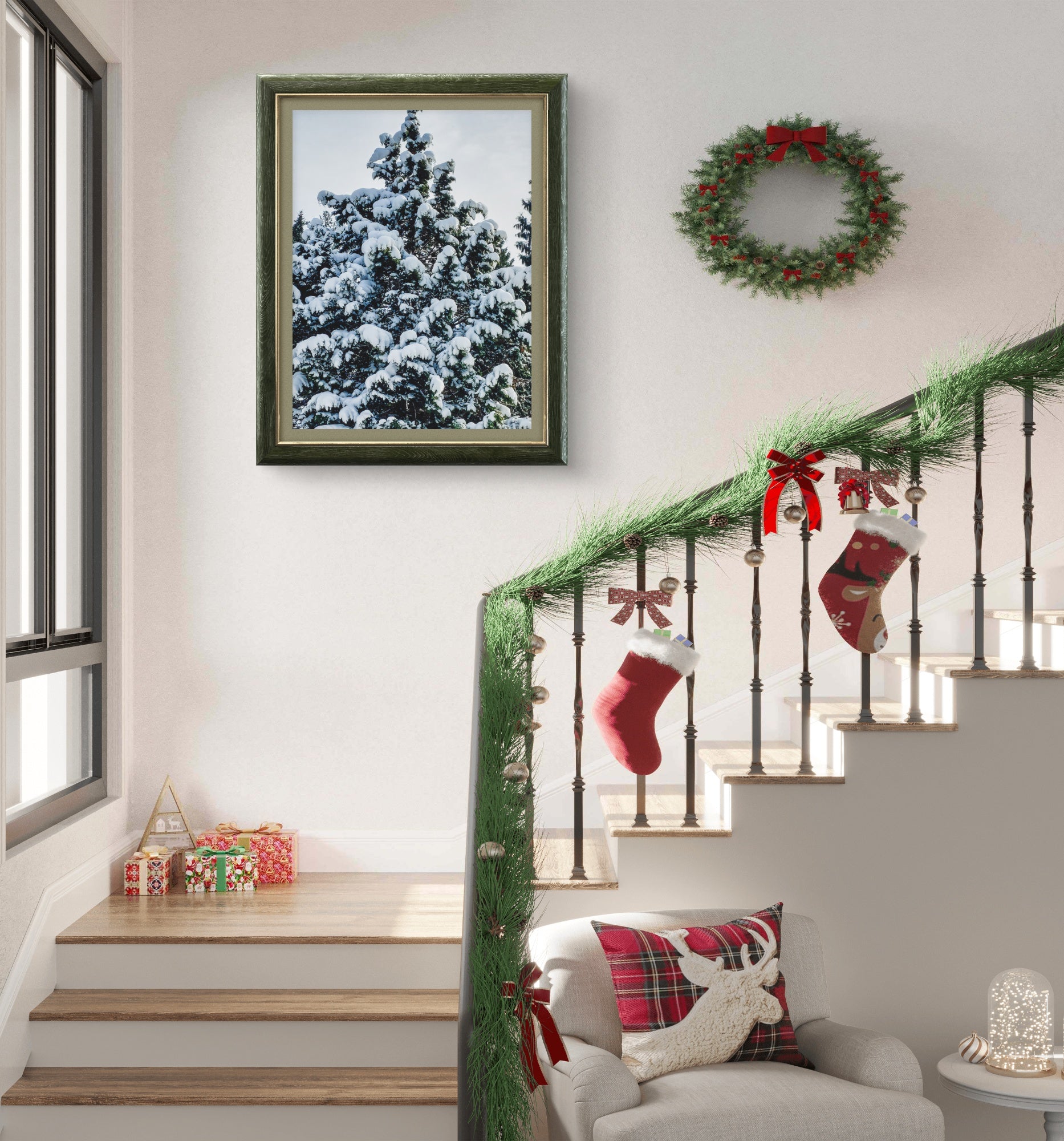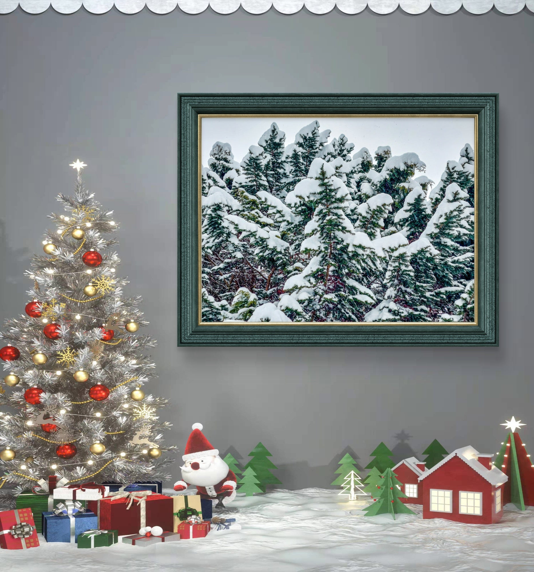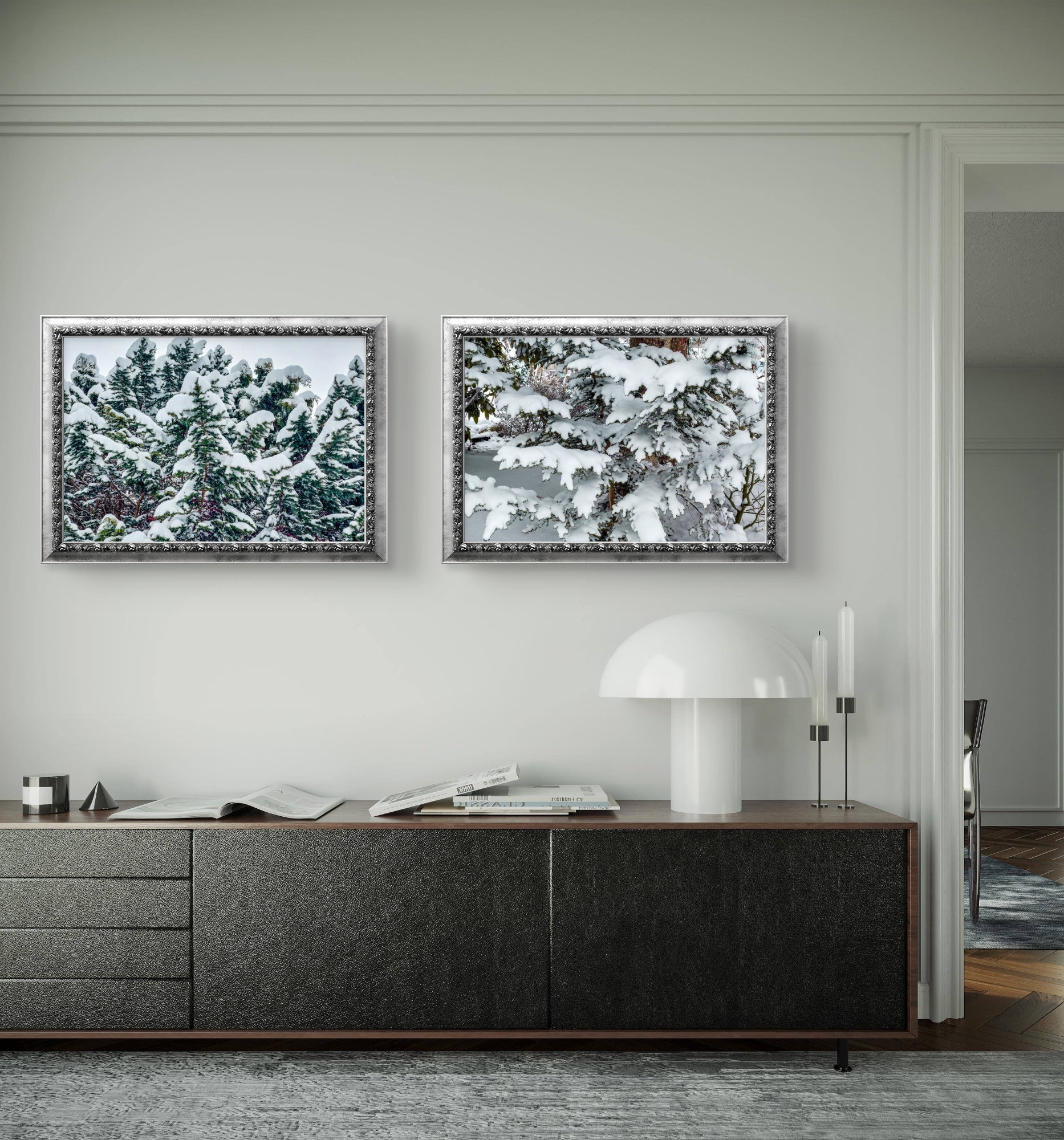 Biophilic design research proves that forest imagery reduces stress by 60% and improves air quality perception (even when viewing photographs!). But there's something uniquely restorative about snow-covered evergreen forests—they represent endurance, tranquility, timeless natural beauty. The mixed vertical/horizontal format solves every design challenge: create dramatic floor-to-ceiling vertical statements, expansive horizontal panoramas above furniture, balanced grids, or dynamic mixed galleries. Unlike sterile winter scenes, these vibrant greens bring life and warmth while maintaining seasonal elegance.