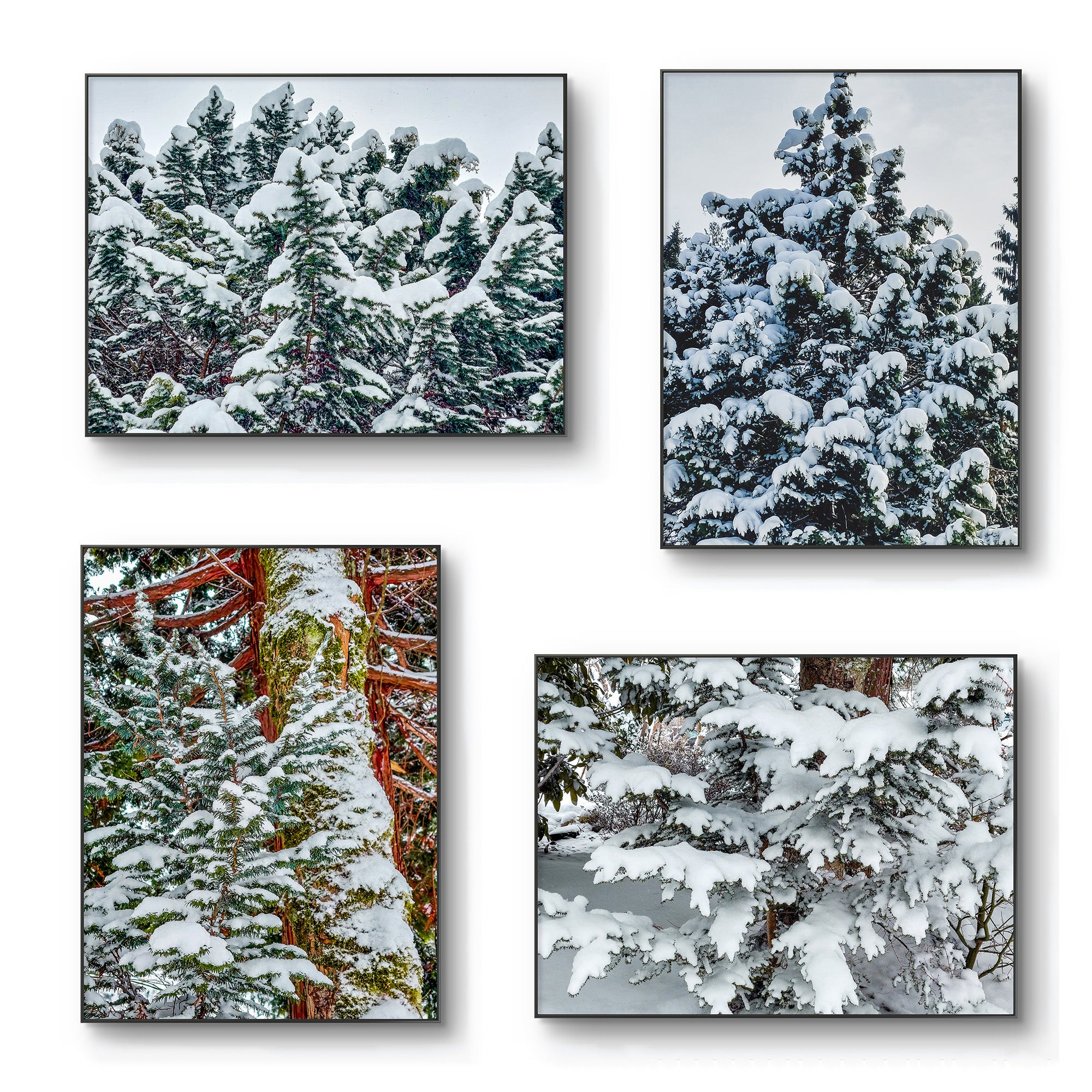 Q: Are all four prints different forest views? A: Yes! Each features unique perspective of the snow-covered evergreen forest: closeup of snow-laden branches with forest depth, mid-distance view showing multiple layered trees, wide panoramic forestscape, and intimate grove composition. All maintain cohesive evergreen-and-snow aesthetic while offering visual variety that creates dynamic galleries.