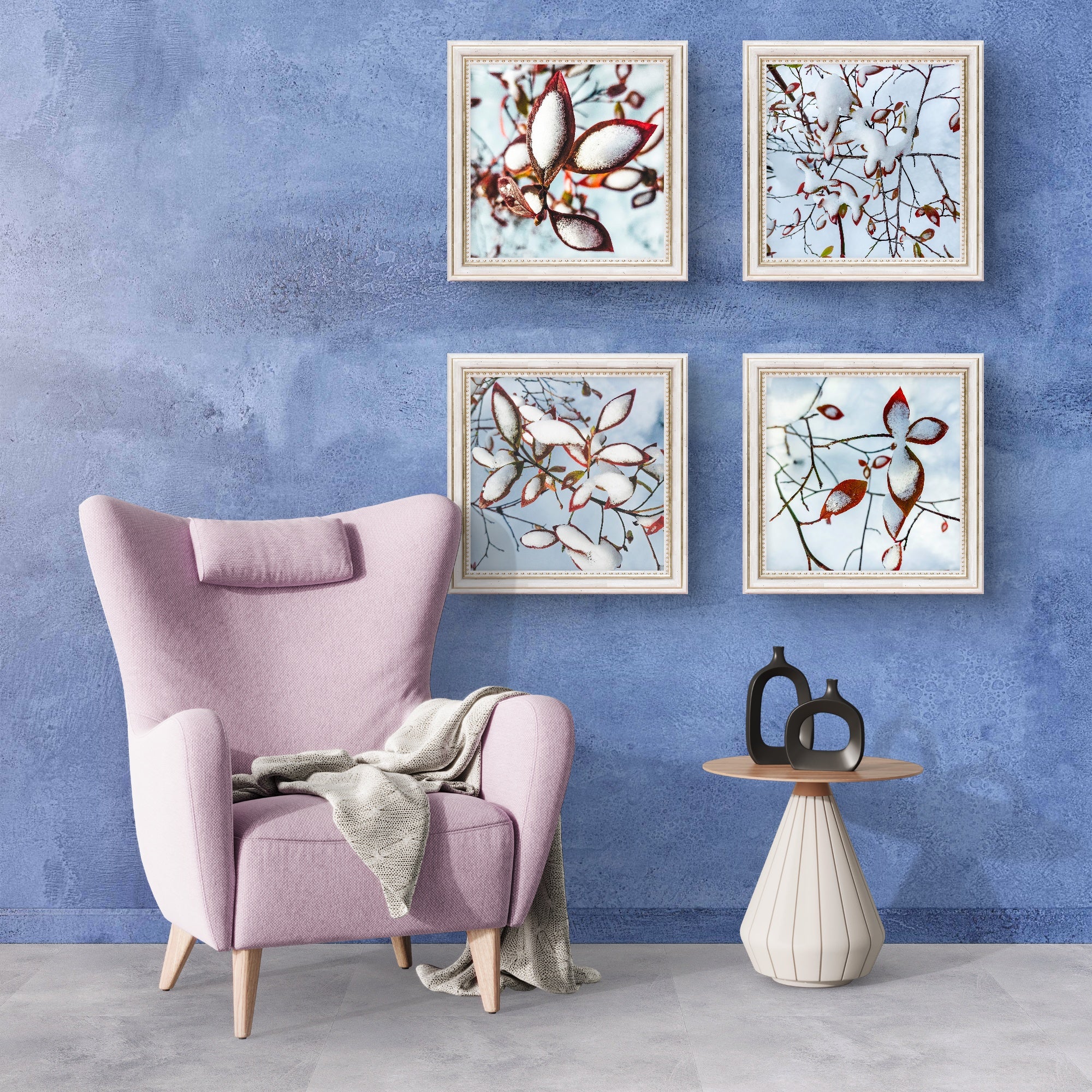 Experience winter's striking beauty with this four-piece square collection featuring authentic macro photography of vibrant red foliage against pristine white-bluish snow. The dramatic contrast creates sophisticated seasonal elegance with modern visual impact.