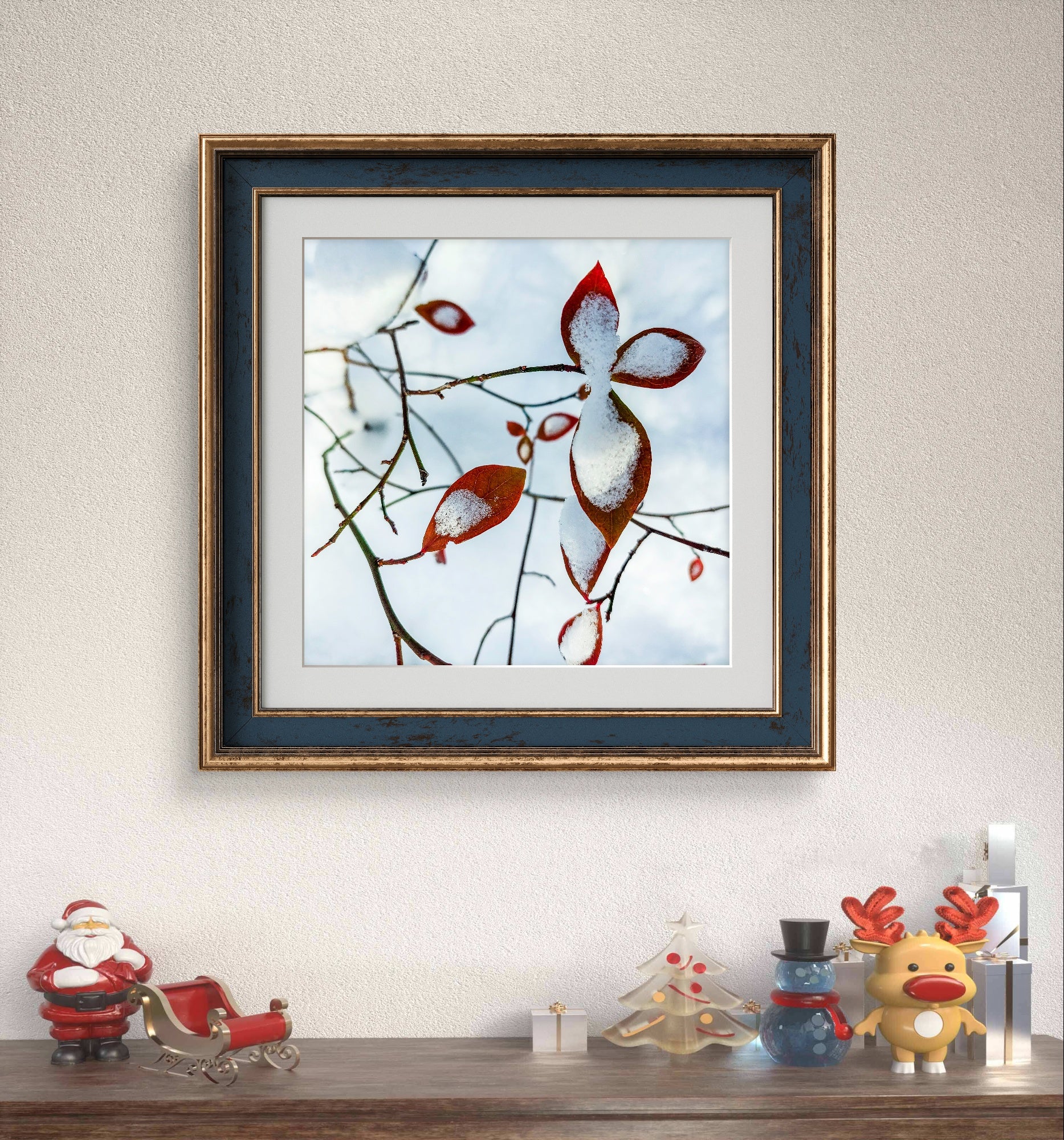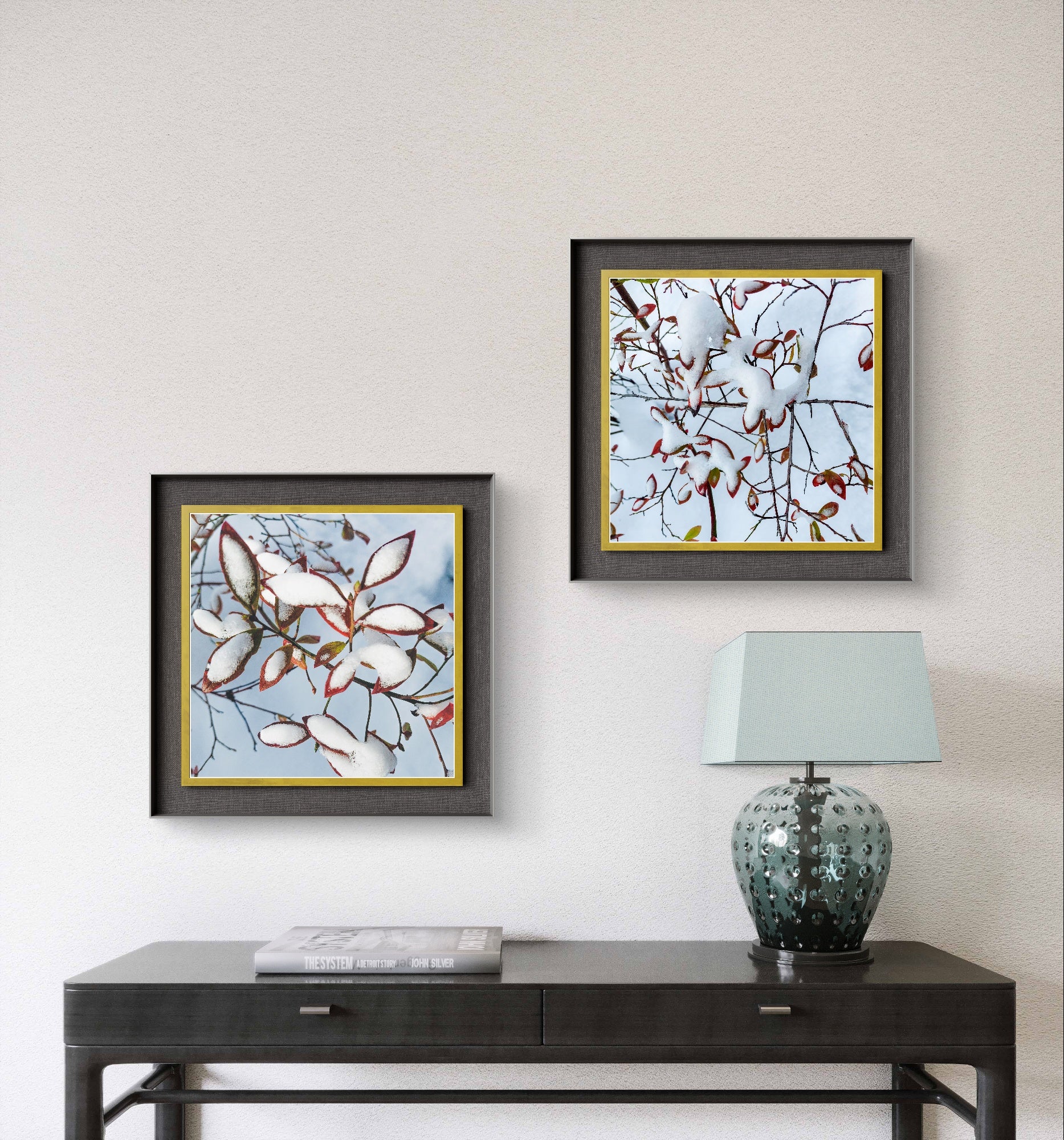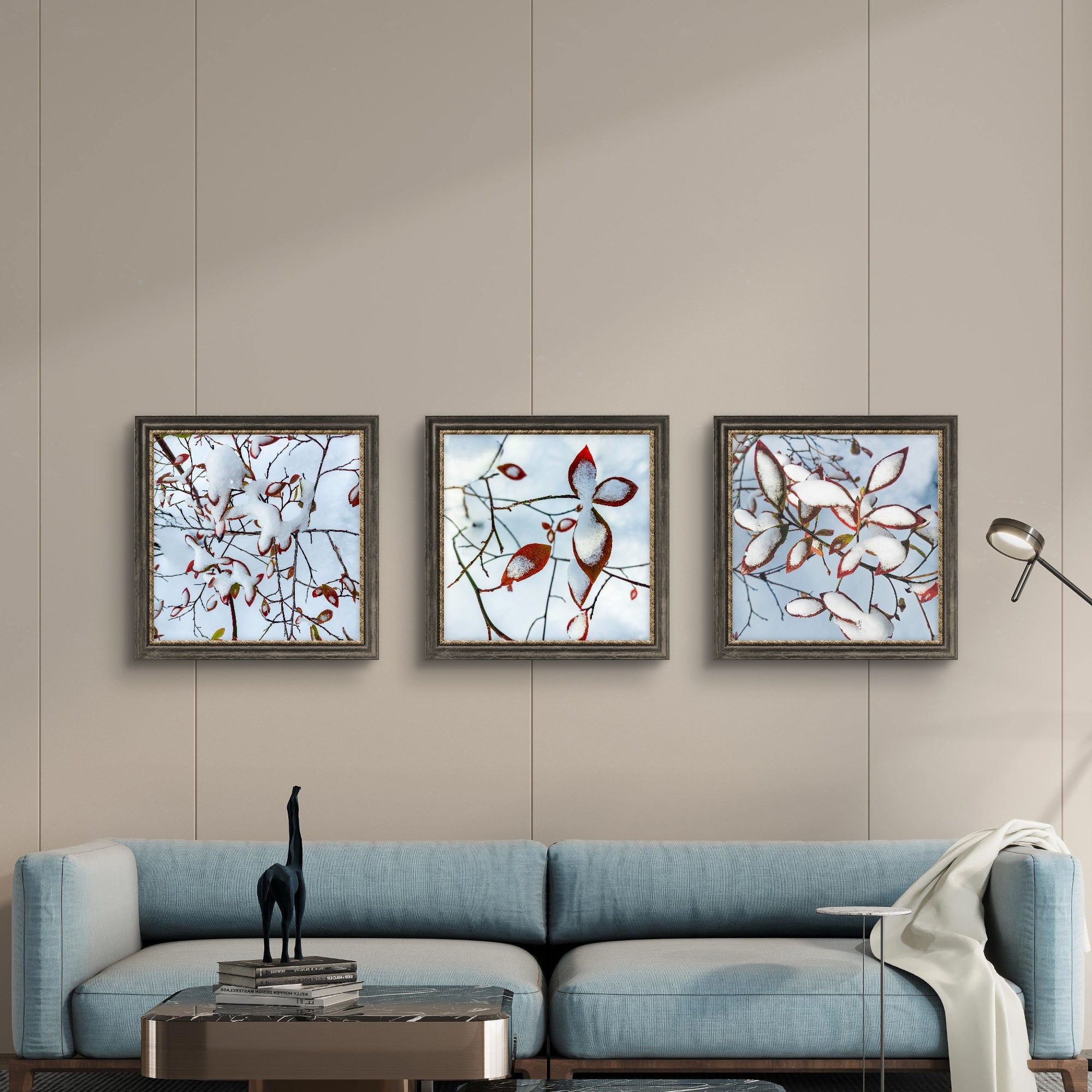 A: You receive four unstretched canvas prints in square format in your selected size. Each features one curated winter snowy red foliage macro photograph. Canvases arrive rolled or flat for shipping protection. Not Included: Framing materials, stretcher bars, hanging hardware, or mounting supplies. This allows customization to match your decor. Use standard square picture frames available at craft stores, have professionally stretched at frame shops, or work with local framers for custom mounting. Consider frame color carefully - white frames complement snow, black creates drama, natural wood adds warmth.