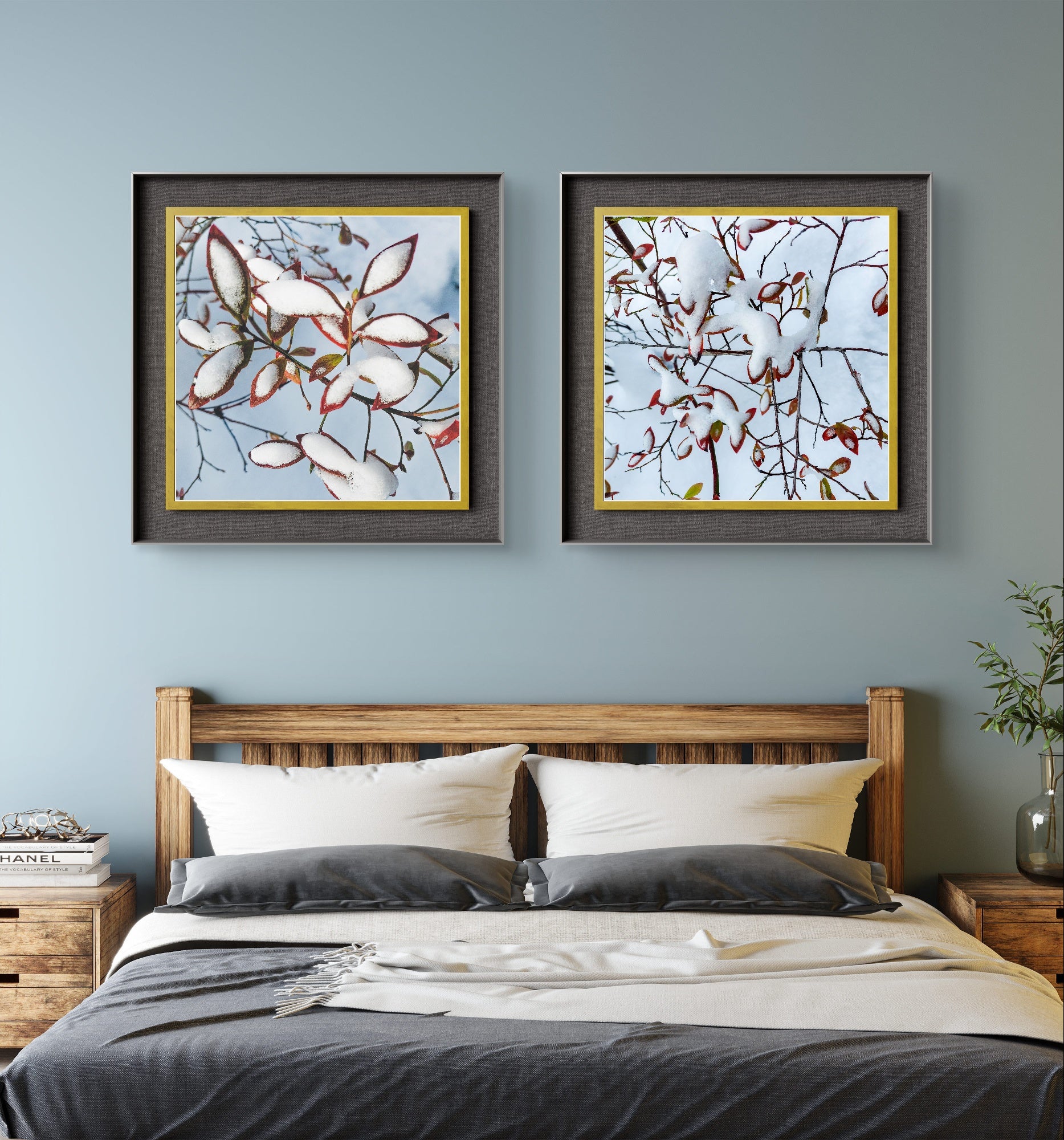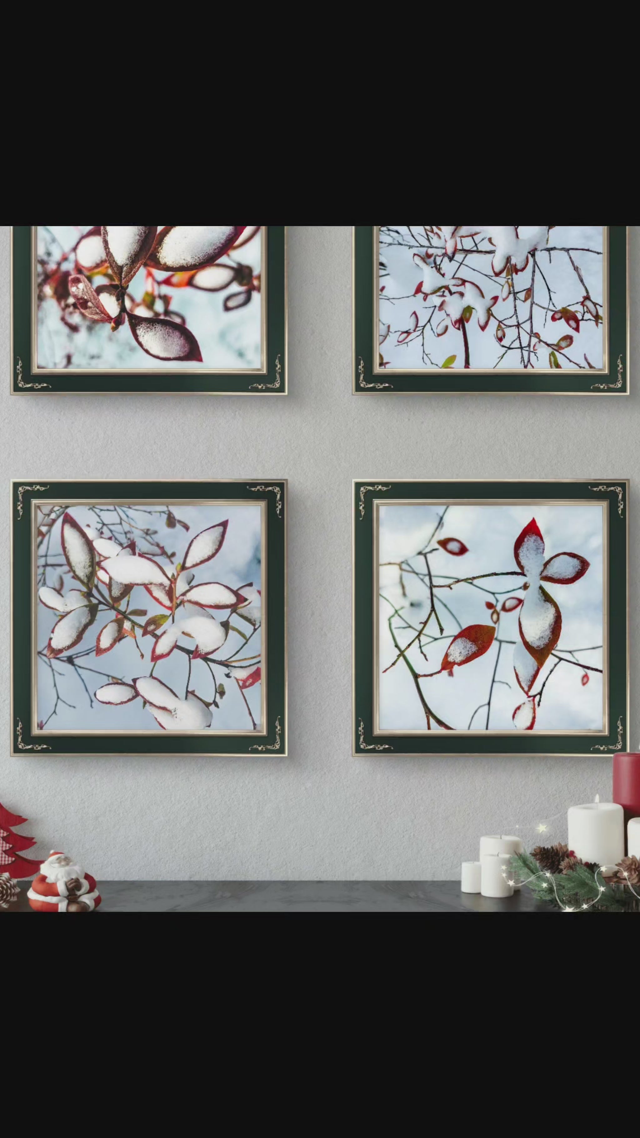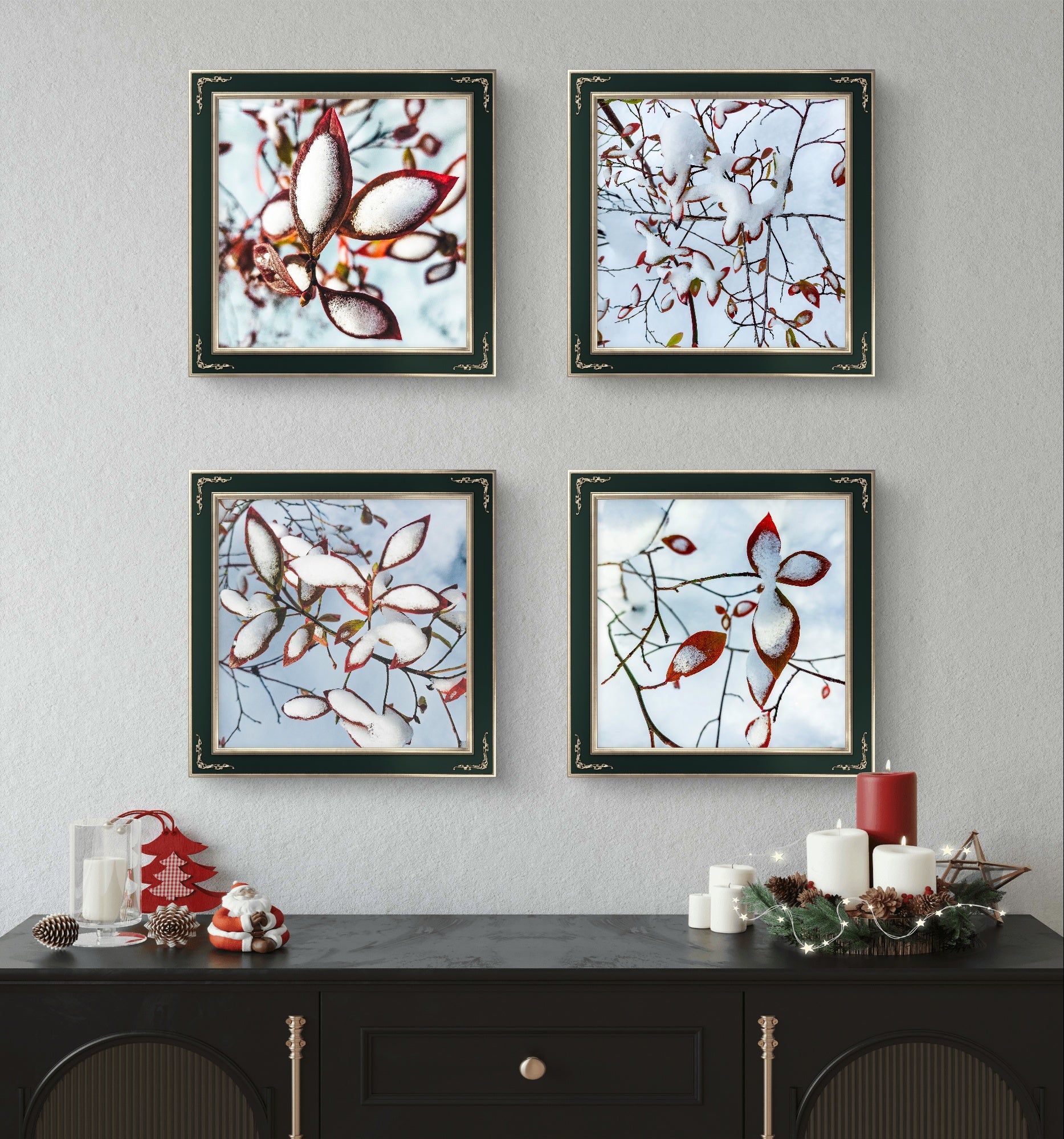 A: This set makes a thoughtful seasonal gift. Holiday Gifting: Perfect for Christmas, Hanukkah, or winter celebration presents. Housewarming: Particularly appropriate for winter moves or mountain home owners. Nature Enthusiasts: Ideal for those appreciating winter beauty and seasonal photography. Photography Lovers: Appeals to those valuing authentic nature macro photography. Substantial Presentation: Four-piece set offers impressive gift impact. Seasonal Decorators: Perfect for those who enjoy rotating decor with seasons. Versatile Recipients: Suitable for family, friends, colleagues who appreciate nature themes. Arrives ready for recipients to customize framing to personal style.