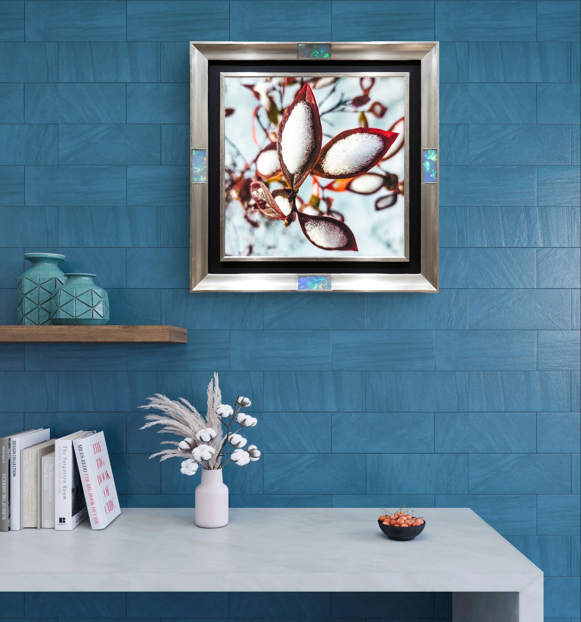 A: Winter photography offers distinct characteristics. Unique Color Palette: Red and white-blue contrast differs from autumn's warm tones or spring's pastels. Seasonal Specificity: Snow element makes this unmistakably winter-themed versus more ambiguous seasonal imagery. Cooling Effect: White and blue tones create psychological cooling versus autumn's warming effect. Holiday Coordination: Times perfectly with winter holiday decorating needs. Limited Duration Display: More likely to be seasonally rotated than year-round botanical themes. Natural Drama: Snow provides dramatic backdrop unavailable in other seasons. Biophilic Winter Connection: Brings outdoor winter beauty indoors during season when nature connection is most difficult.