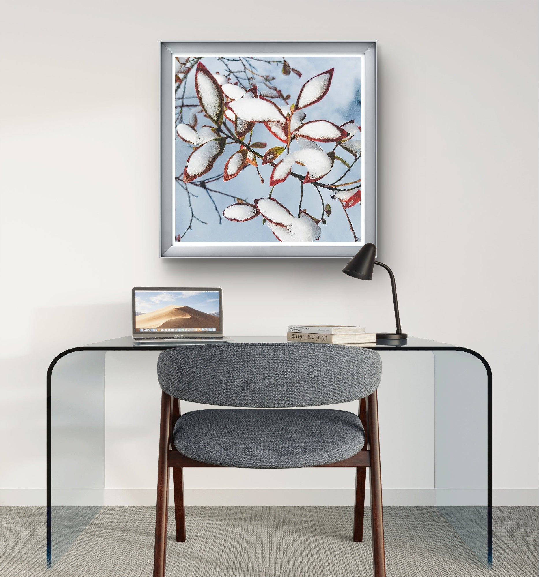 A: This dramatic contrast offers unique design advantages. Visual Drama: High contrast between warm red and cool white-blue creates immediate visual interest. Winter Sophistication: More refined than typical winter blue-white themes, adding unexpected warmth. Versatile Coordination: Red provides warmth while snow tones coordinate with cool and neutral palettes. Seasonal Flexibility: Red foliage works for both holiday and general winter display. Contemporary Appeal: Bold contrast aligns with modern design preferences for statement pieces. Mood Balance: Warm red prevents cold winter imagery from feeling too stark or uninviting. Year-Round Potential: The nature-focused composition transcends strict seasonal limitations.