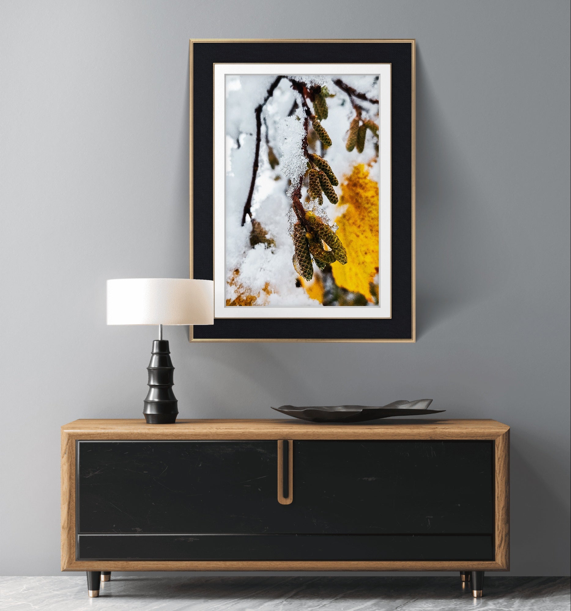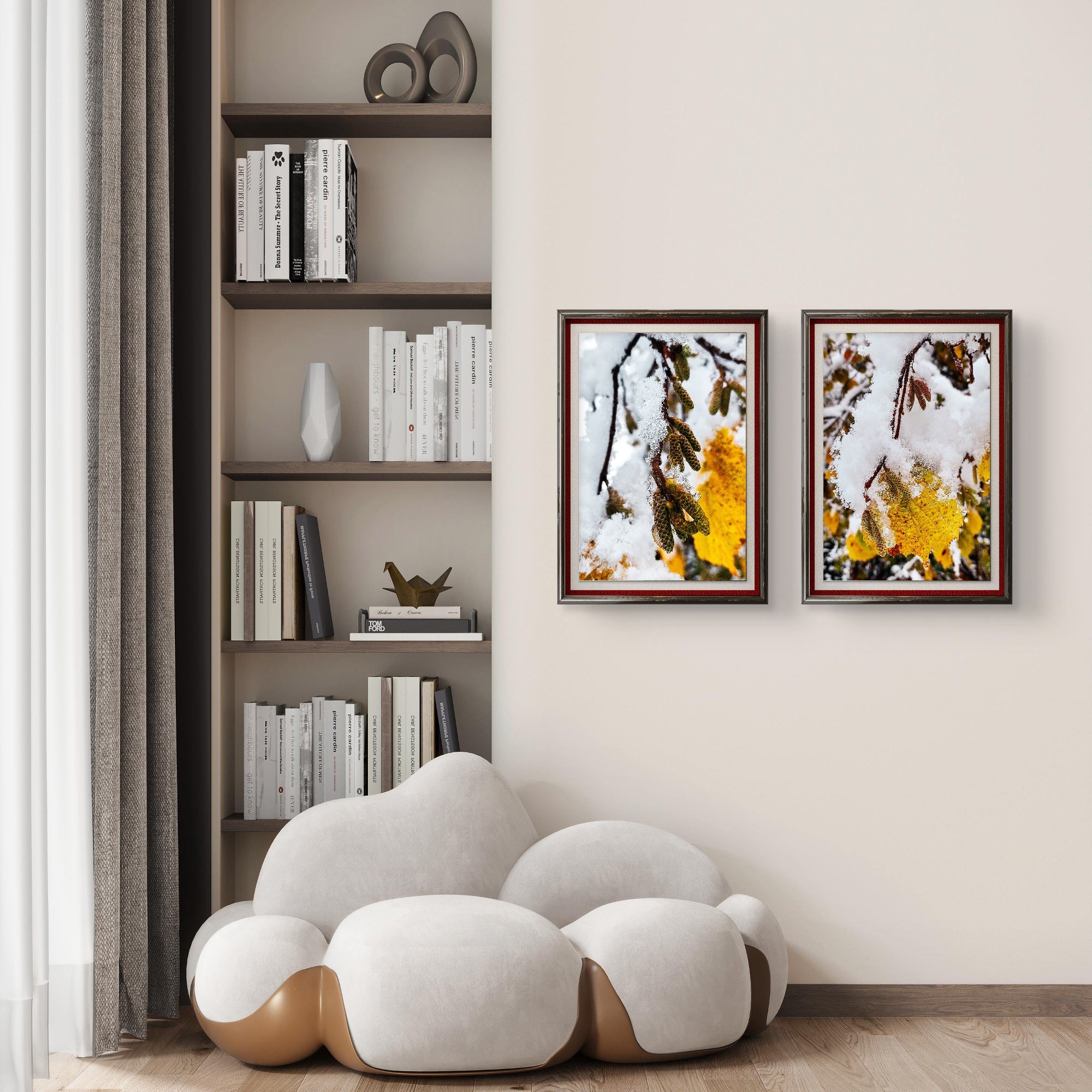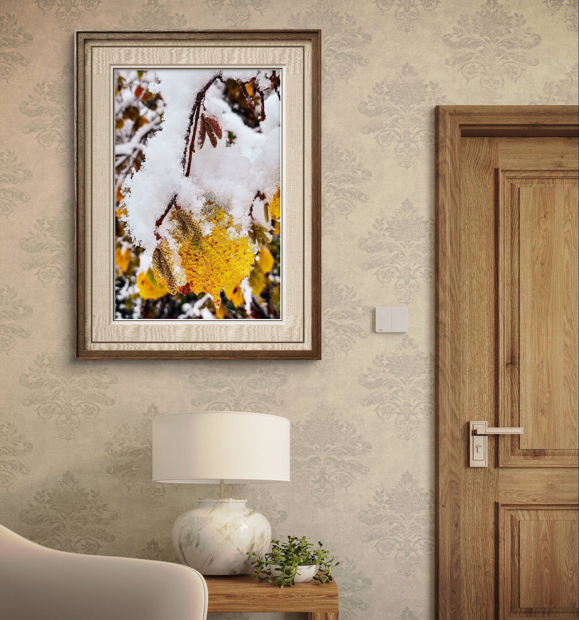 A: This is 100% authentic nature photography captured by The Virtue of God, a woman-owned photography business in Washington State. I personally photographed these snow-covered yellow leaves in a moning during winter 2024. Every detail—the frost and snow, leaf veins, melting drops, and color gradients—is real. I never use AI-generated imagery or stock photos. Each print comes from my original photograph taken in the Pacific Northwest wilderness.