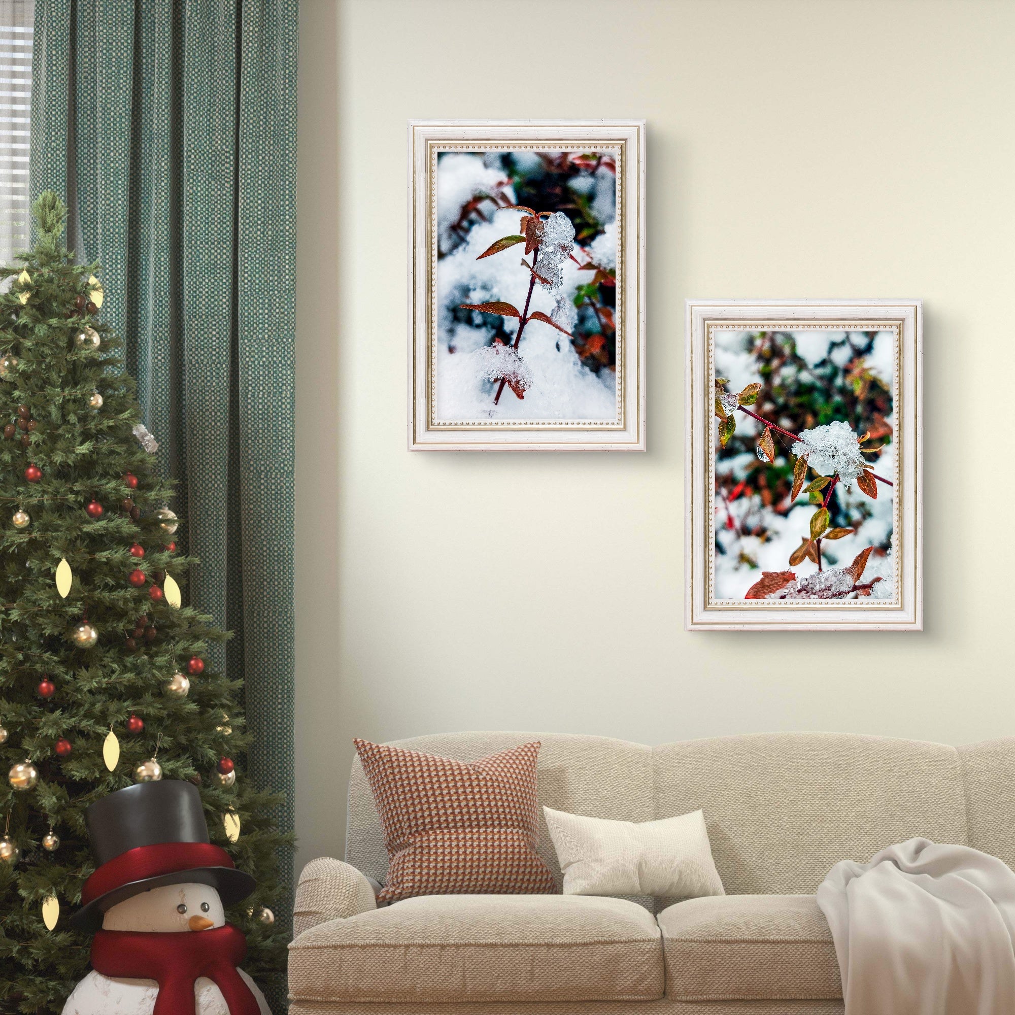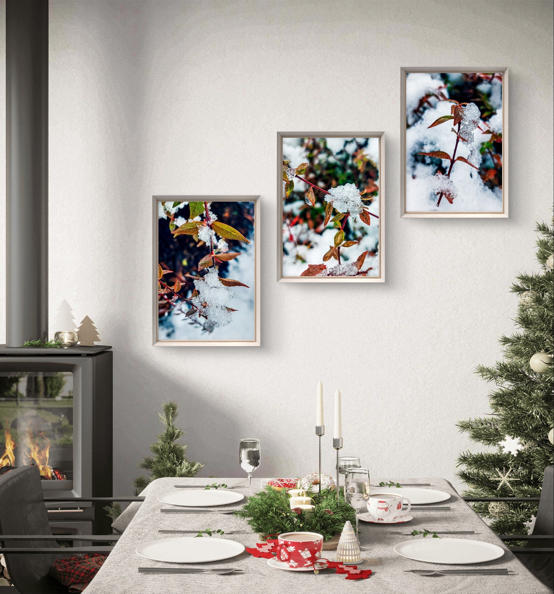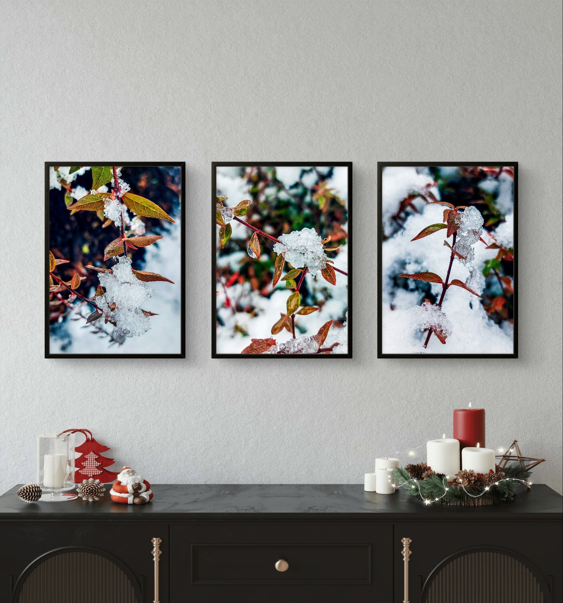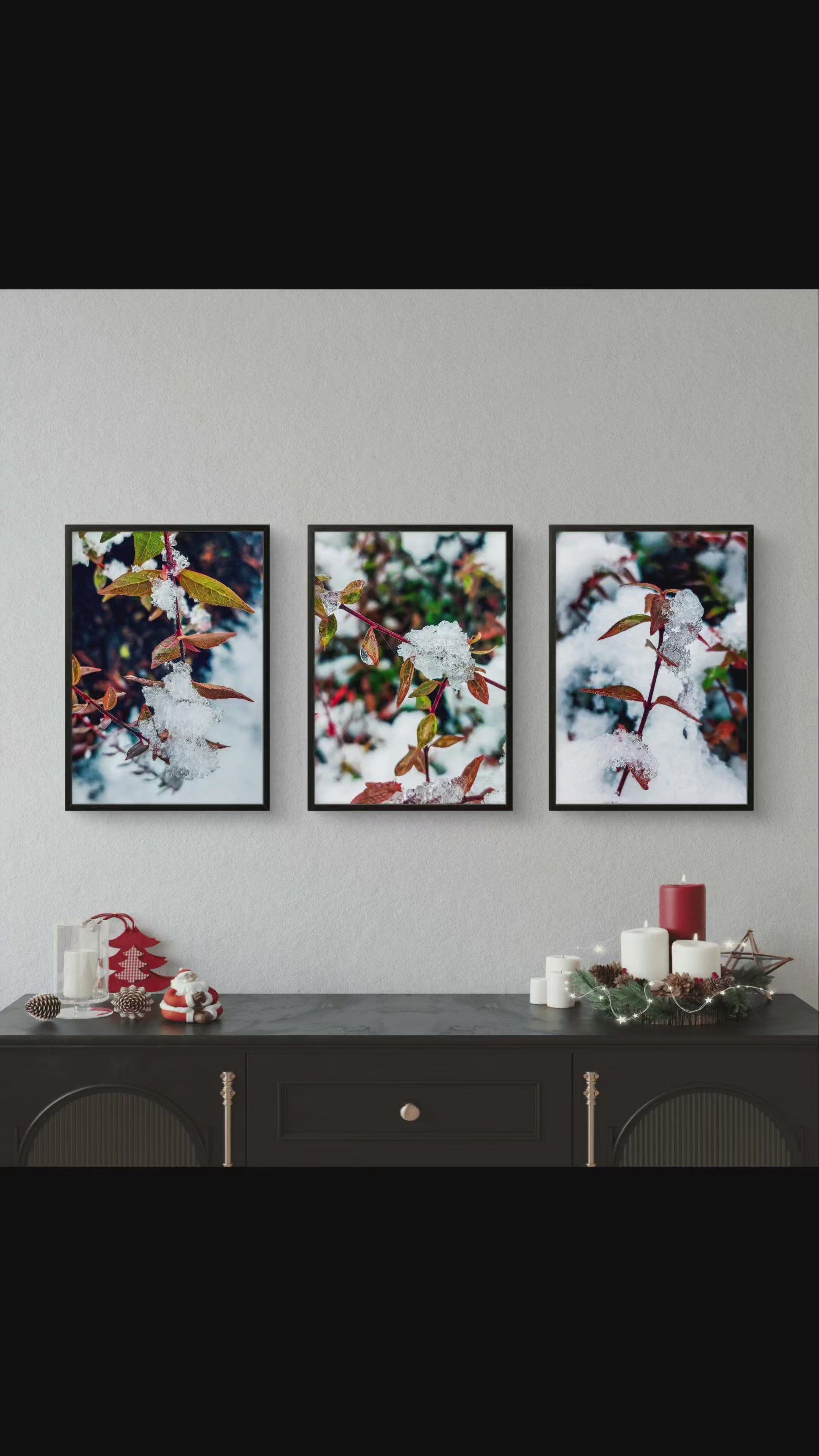 A: This elegant three-piece set makes a thoughtful gift with broad appeal across multiple occasions and recipient profiles. Winter Holidays: Perfect for Christmas, Hanukkah, winter solstice celebrations, or New Year gifts. The seasonal timing aligns beautifully. Housewarming: Provides instant coordinated wall art for new homes - three pieces offer substantial coverage and cohesive design. Nature Enthusiasts: Ideal for those appreciating winter beauty, macro photography, botanical subjects, or seasonal cycles. Photography Lovers: Appeals to those valuing technical photographic skill and nature documentation. Seasonal Decorators: Perfect for those who enjoy rotating décor with seasons and maintain winter collections. Cozy Home Lovers: The warm-cool balance creates hygge-inspired atmosphere popular in winter design. Transitional Gifts: Appropriate for autumn-to-winter birthday celebrants (October-January). Retirement Presents: Nature photography popular for those with more time to appreciate detail and beauty. Get Well/Encouragement: Frost surviving on leaves symbolizes resilience and enduring beauty through challenges. Gender Neutral Appeal: Sophisticated palette and nature subject appeals universally. Age Versatile: Appropriate from young adults appreciating Instagram-worthy nature aesthetics to seniors valuing classic nature photography. Substantial Presentation: Three-piece set feels more impressive than single prints while remaining affordably priced. Customization Benefit: Recipients can frame to their personal taste and existing décor style.