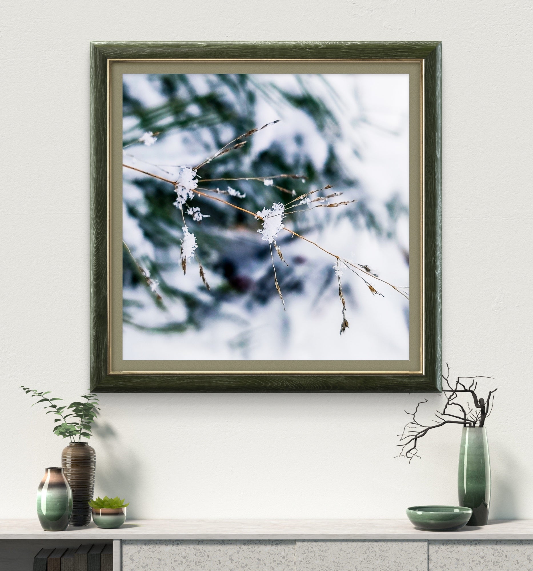 Biophilic design research confirms that nature imagery—especially minimalist winter scenes—reduces stress by 60% and promotes mental clarity. But there's something uniquely meditative about this composition: the gentle curves of grass under snow's weight, the delicate balance, the quiet strength. The square format offers exceptional versatility: hang solo for zen simplicity, create 2×2 grids, diamond patterns, or scattered arrangements. Unlike busy botanical prints, this minimalist aesthetic provides visual rest—a breathing space for overwhelmed minds.