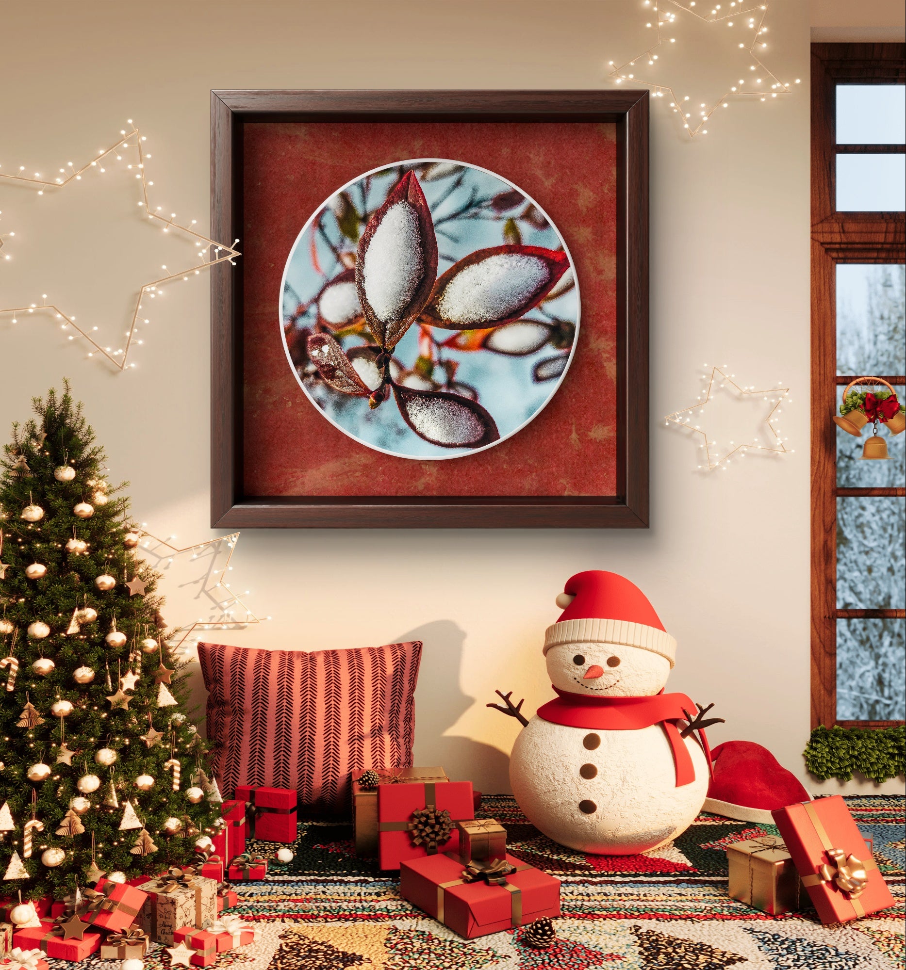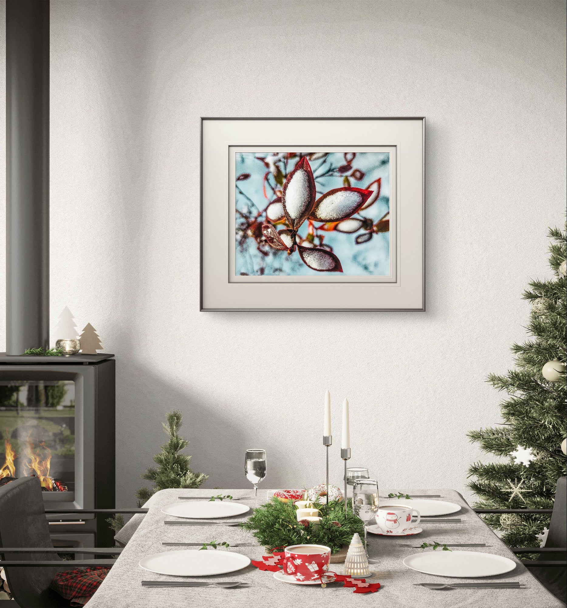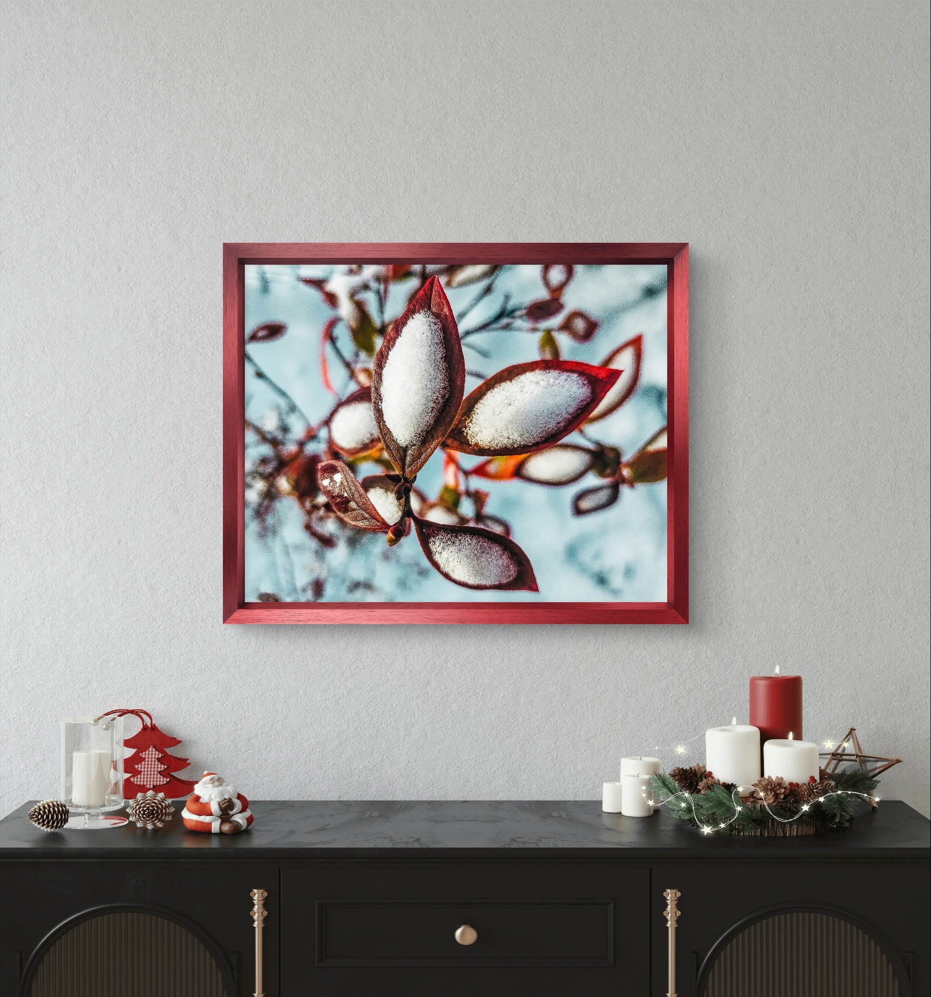 Biophilic design for wellness: Scientific research shows that nature imagery reduces stress, improves focus, and enhances mental wellbeing. The warm red-brown tones paired with cool winter whites create visual balance that brings calm to any space. Perfect for bedrooms, living rooms, meditation spaces, or offices where you need peaceful inspiration.