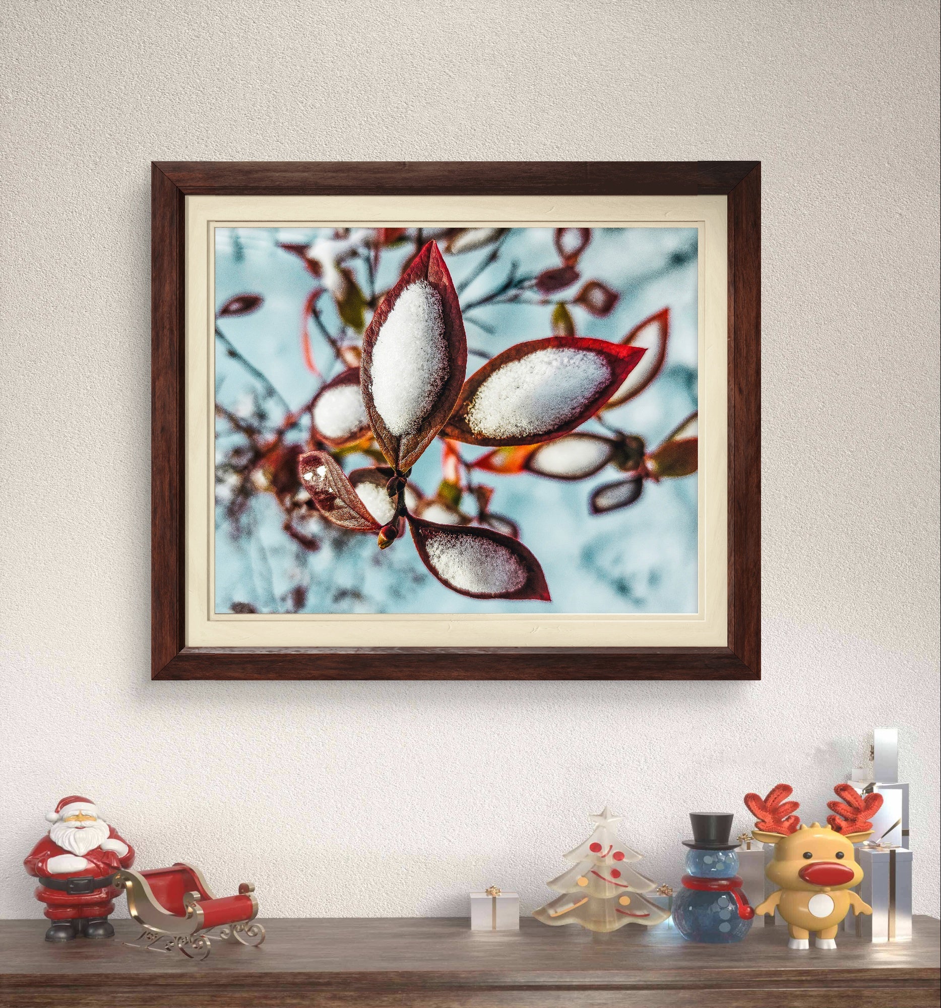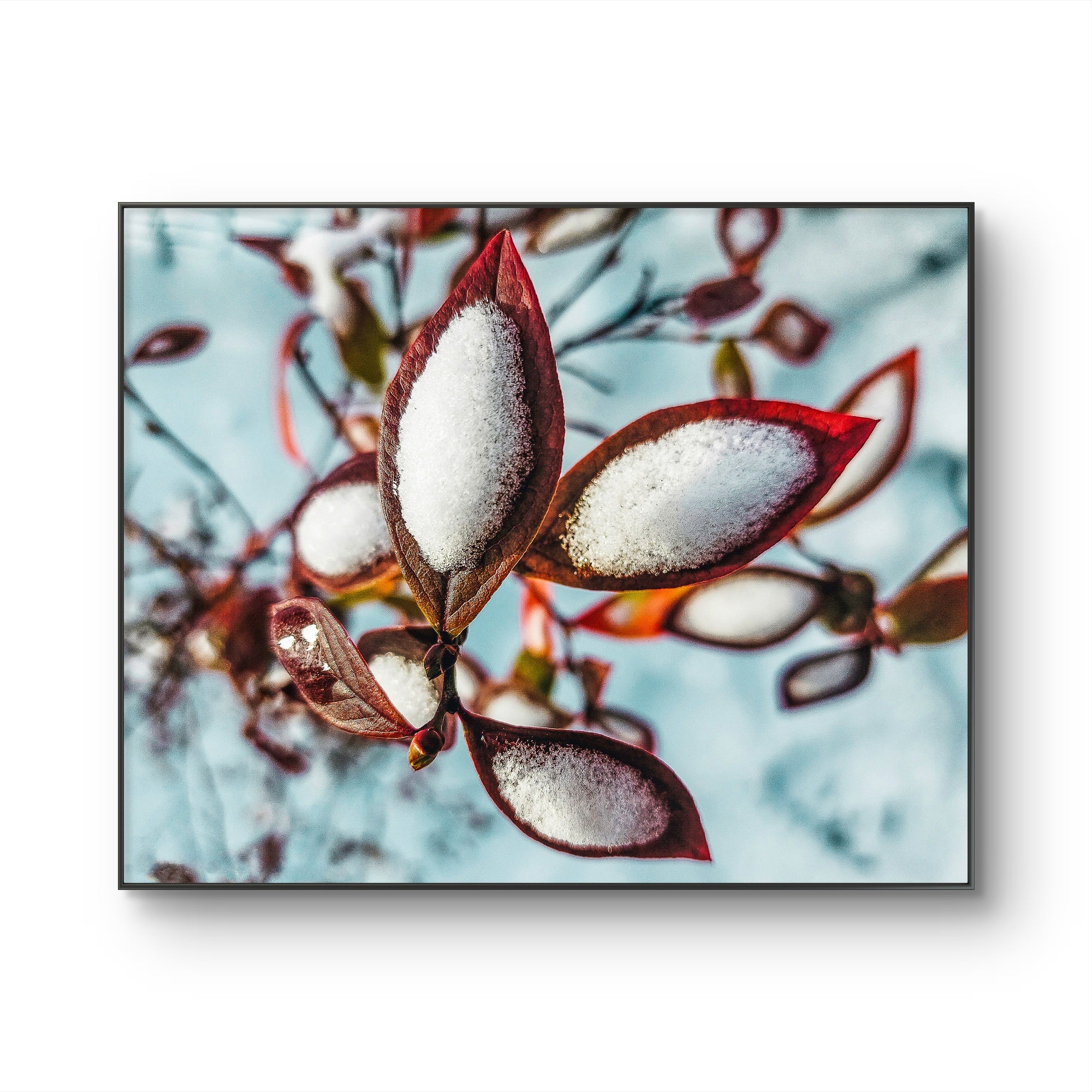 A: Colors may vary slightly due to monitor calibration differences, but this print features: deep red-brown leaves (burgundy to rust tones), white-to-pale-blue snow (frost and ice crystals), and soft blue-gray winter sky background. The sunset lighting adds warm golden undertones. I use professional color-managed printing to ensure accurate reproduction. If you're concerned about color matching for your decor, contact me for a detailed color swatch description before ordering.
