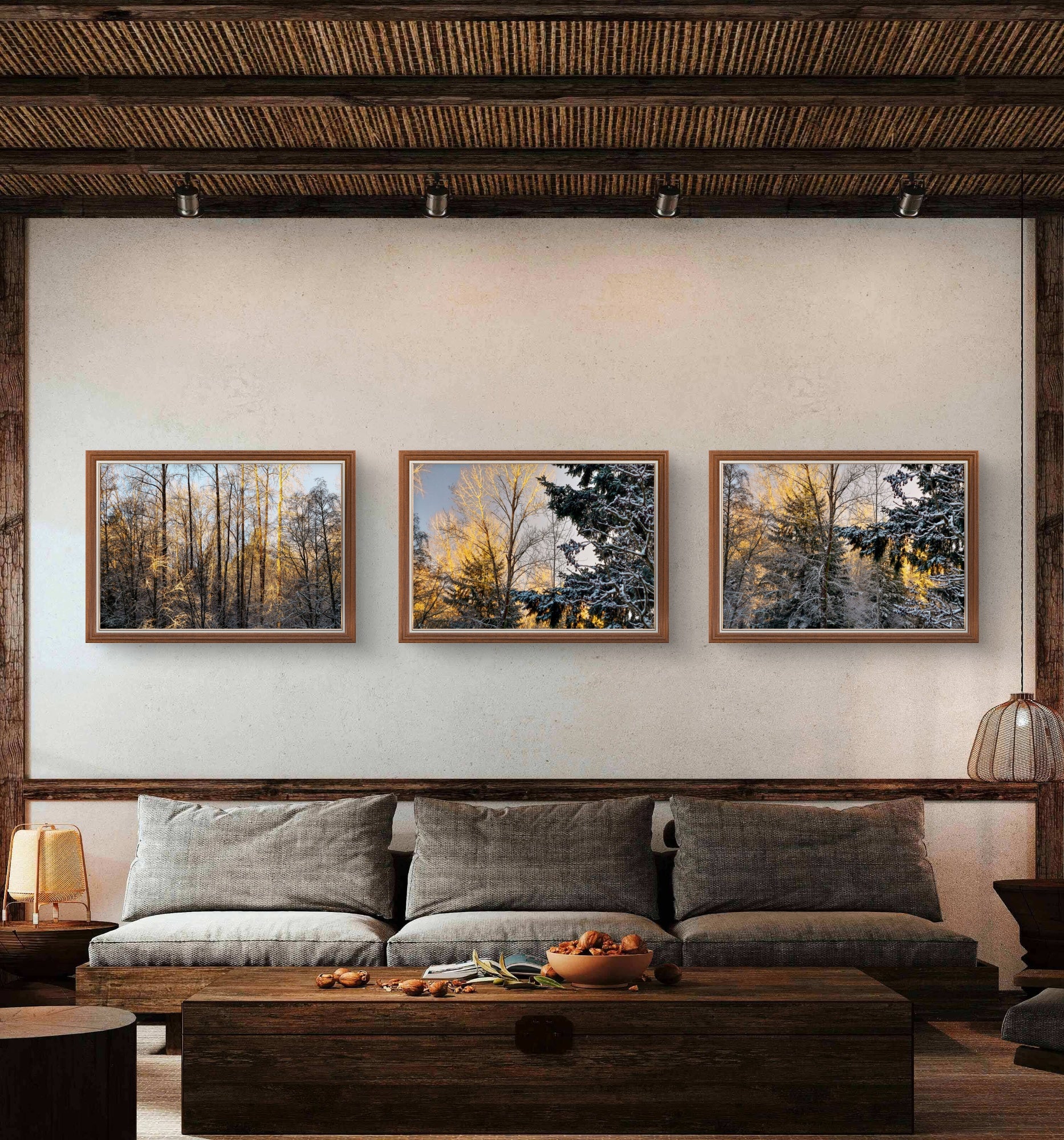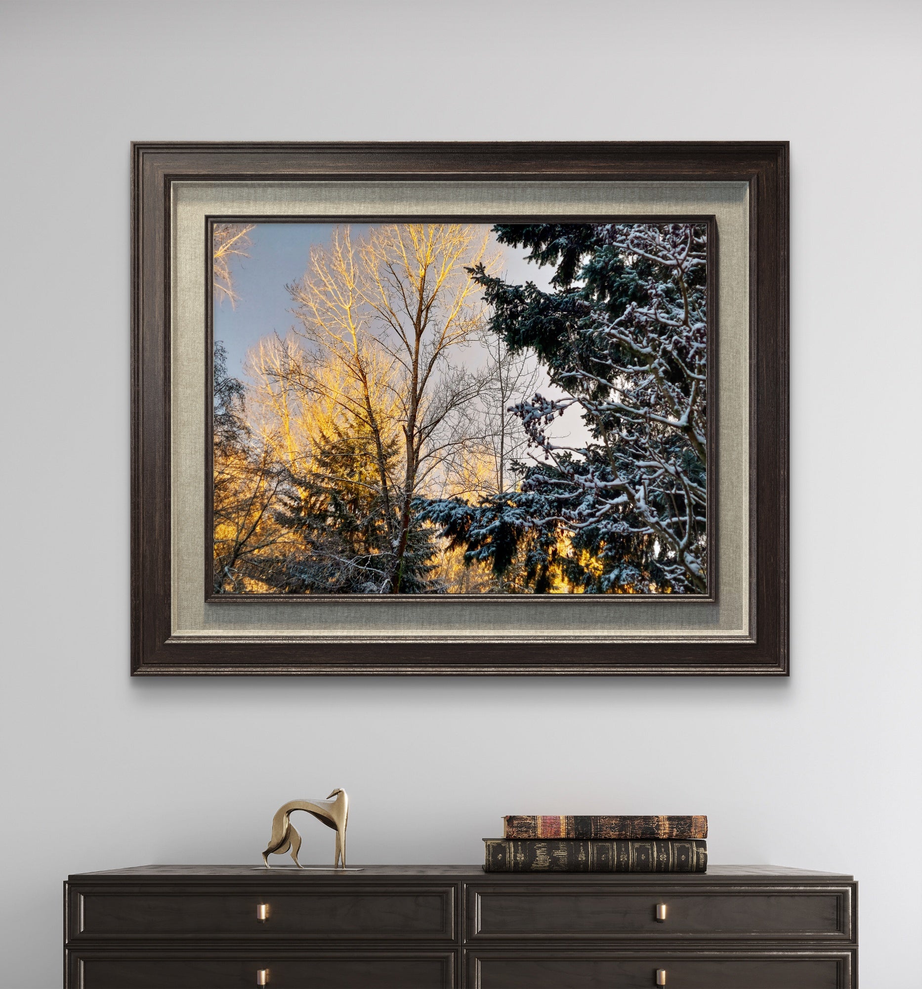 While this captures winter, the warm golden sunrise tones make it perfect for year-round display. Unlike overtly "Christmas" or "holiday" decor, this print celebrates winter's natural beauty with warm, inviting colors that work in all seasons. Many customers keep winter photography up year-round because it brings calm, peaceful energy to their space.